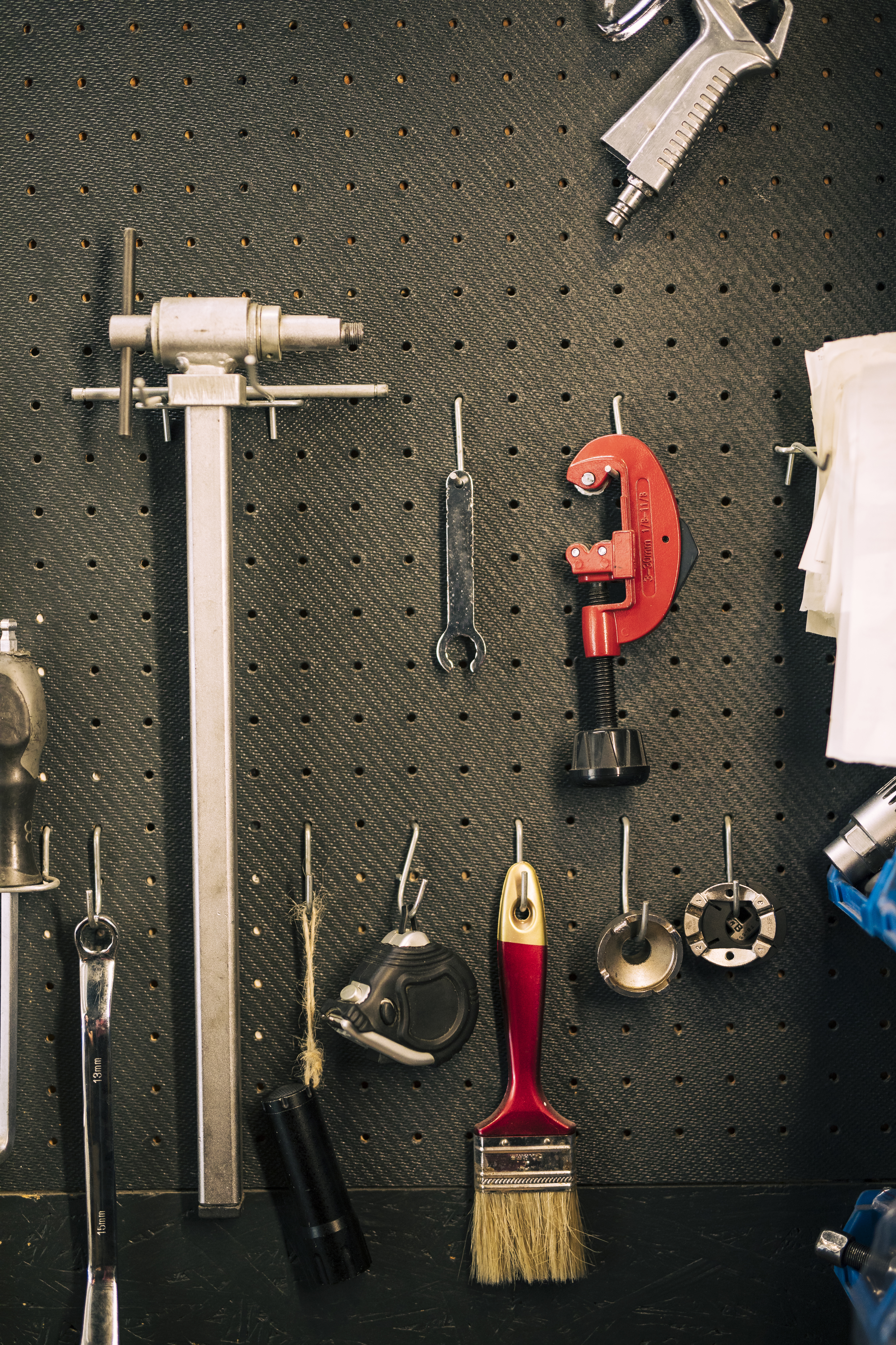 - Zamontuj tablicę perforowaną lub system paneli slat-/railwall z hakami. Dzięki temu klucze, śrubokręty, młotki czy wkrętarki będą na oku.