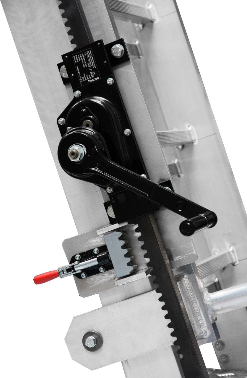 Zębatka posiada korbkę, jest bardzo łatwa w konserwacji (brak możliwości zerwania lub przekręcenia łańcucha). Dzięki niej można w łatwy sposób regulować wysokość drabiny w pionie każdorazowo co szczebel o 280 mm z użyciem niewielkiej siły. Dodatkowo zębatka posiada blokadę.