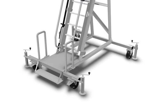 Stabilizator drabiny wykonany jest ze stali ocynkowanej oraz został wyposażony w uchwyt do łatwego przesuwania drabiny. Stabilizator jezdny posiada koła gumowe (opony).