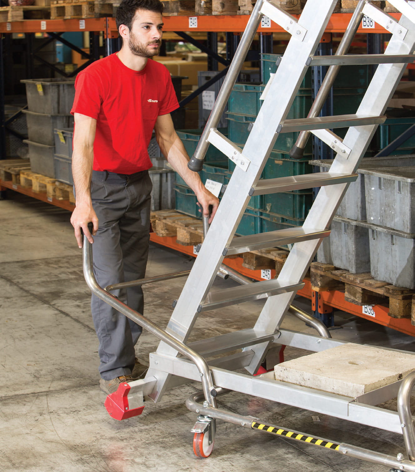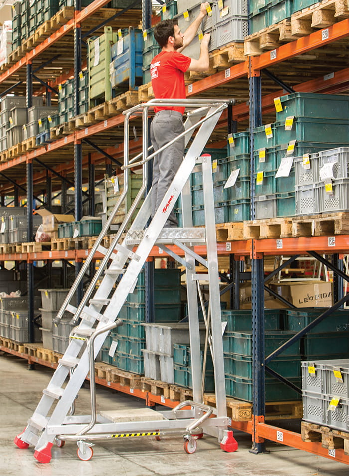 Drabina magazynowa FARAONE z serii MF.TS to konstrukcja przeznaczona do intensywnych prac magazynowych. Dzięki wysokiej jakości wykonania konstrukcja ta spełnia wszystkie europejskie normy i wymogi bezpieczeństwa. Drabina magazynowa MF.TS standardowo wyposażona jest w zestaw zabezpieczeń SICIUR STOP, który umożliwia przesuwanie drabin na 4 kółkach z ciężarem powyżej 20 kg i maksymalnie 100 Kg. Drążek zabezpieczający uniemożliwia wejście, kiedy drabina stoi na kółkach i zwalnia dostęp.