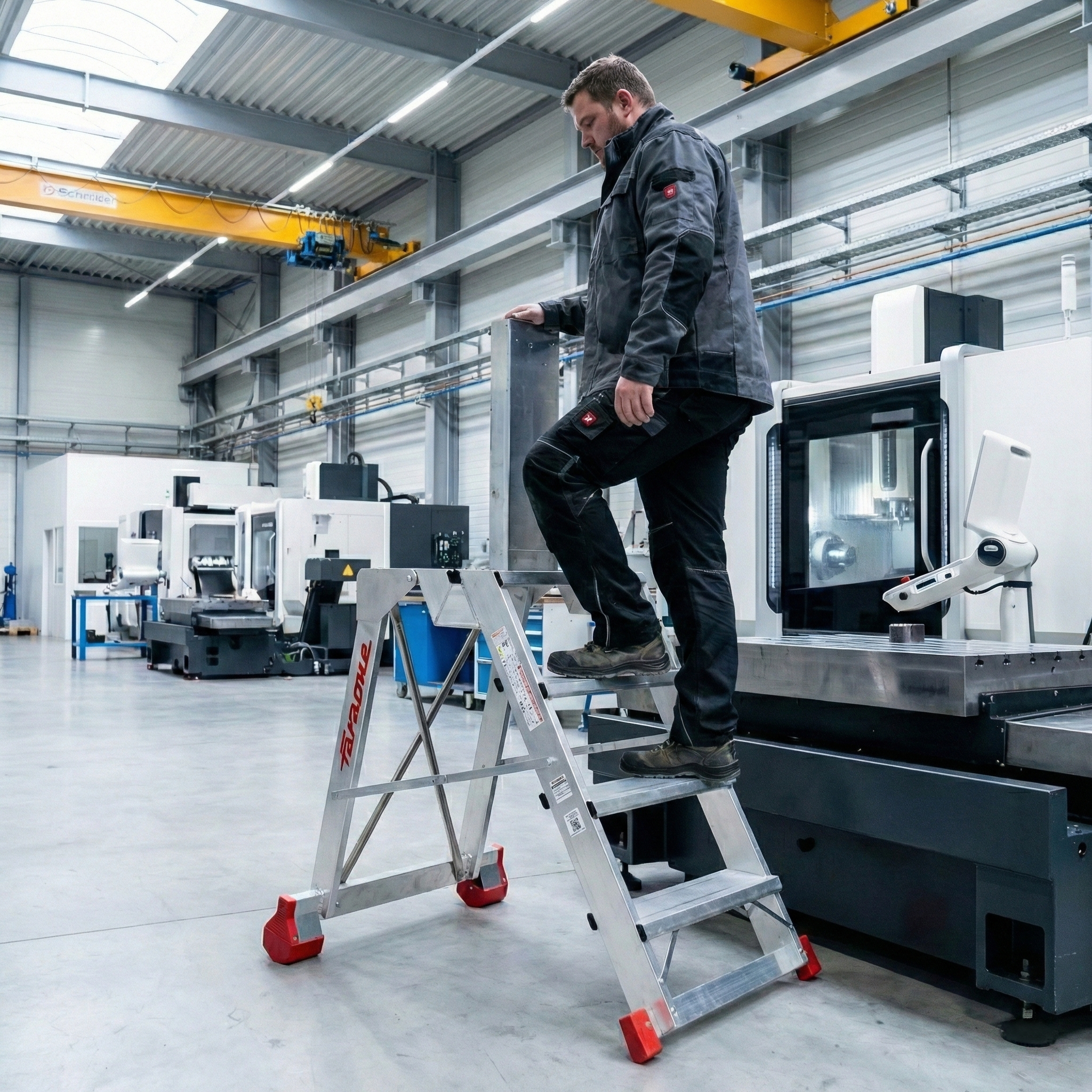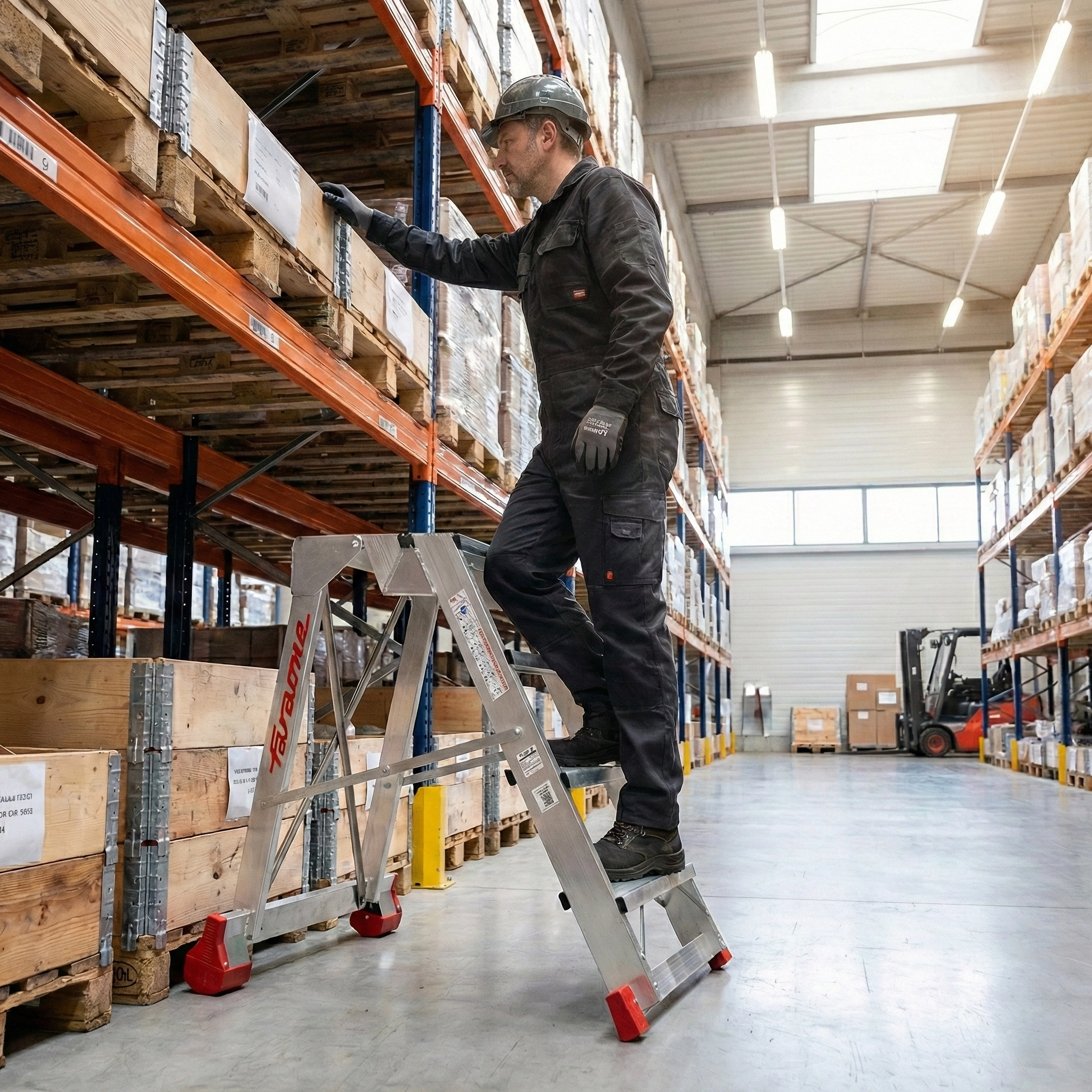 ✅ Podest posiada intuicyjny system składania, dzięki czemu po pracy zajmuje minimum miejsca w magazynie. Lekkość aluminium sprawia, że transport między stanowiskami jest błyskawiczny i nie wymaga wysiłku.