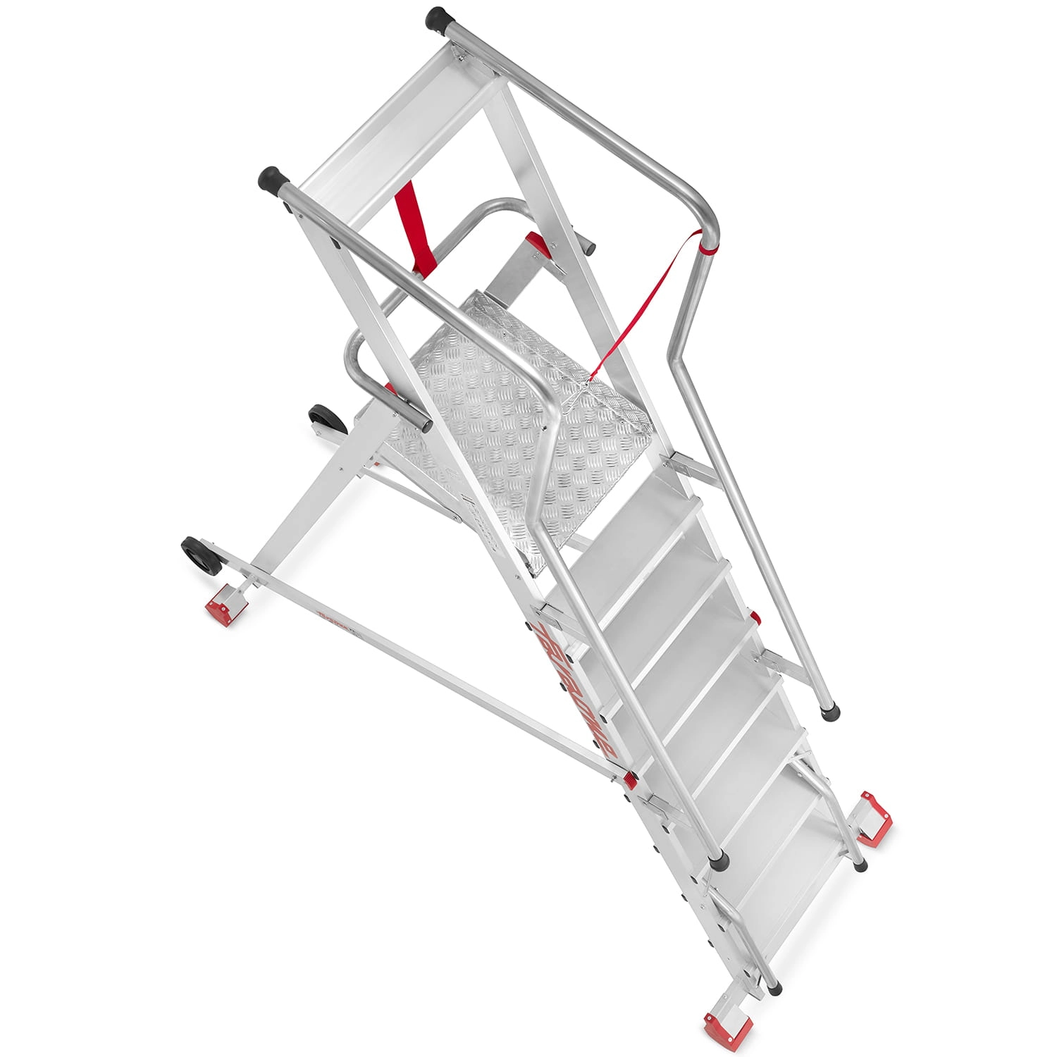 ✅ podstawa stabilizująca wyposażona w dwie stopy z wielokomorowego profilu otulone elastycznym tworzywem antypoślizgowym, co zapewnia stabilne oparcie podestu w czasie pracy