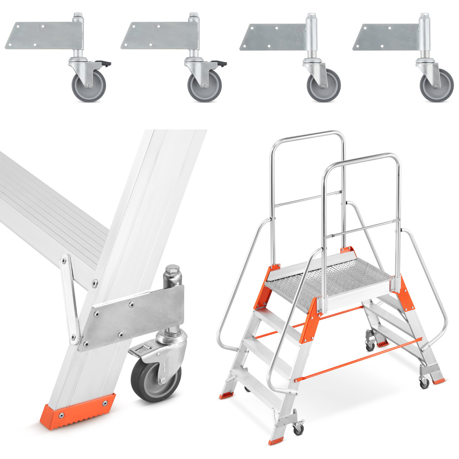 - Łatwość manewrowania: Cztery w pełni skrętne koła 360° pozwalają na swobodne manewrowanie drabiną w każdym kierunku i precyzyjną zmianę położenia względem regału.