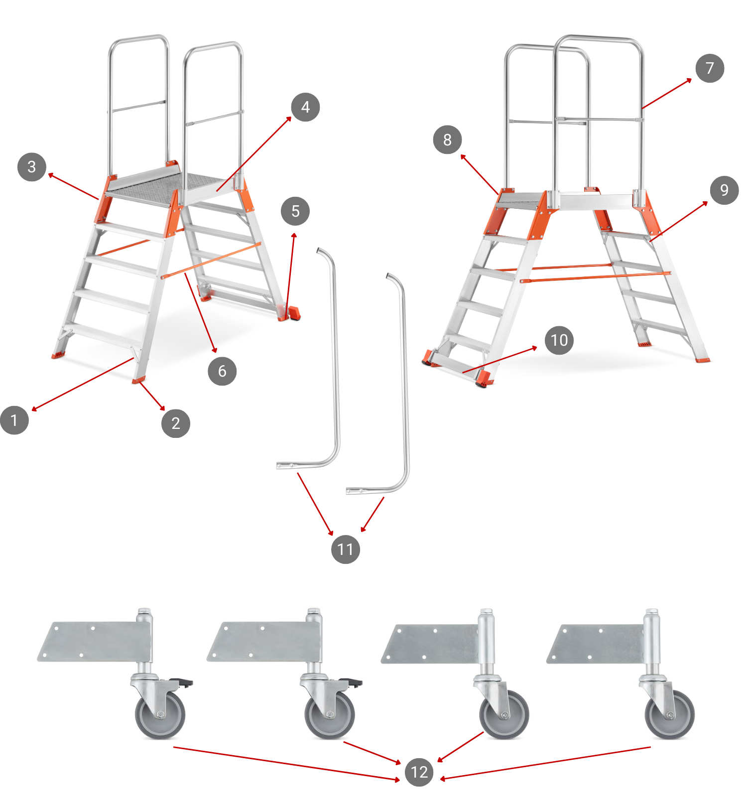 Aby w pełni wykorzystać możliwości jakie oferuje drabina, rekomendujemy zastosowanie czterech kół sprężynowych, co zapewnia najszybsze i najłatwiejsze przemieszczanie konstrukcji. Dodatkowo, dla znacznego podniesienia komfortu i bezpieczeństwa podczas codziennej pracy, zalecamy zakup poręczy wejścia.