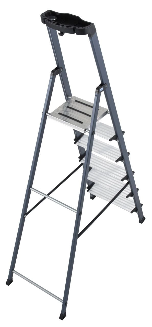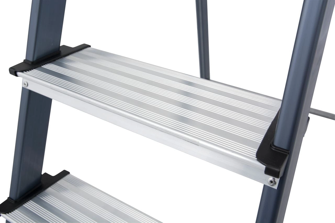 Drabina KRAUSE Securo charakteryzuje się dużymi, ryflowanymi, antypoślizgowymi stopniami o głębokości 125 mm. Dodatkowo krawędzie stopni zostały zabezpieczone specjalnymi nakładkami z tworzywa sztucznego w celu zwiększenia bezpieczeństwa i komfortu.