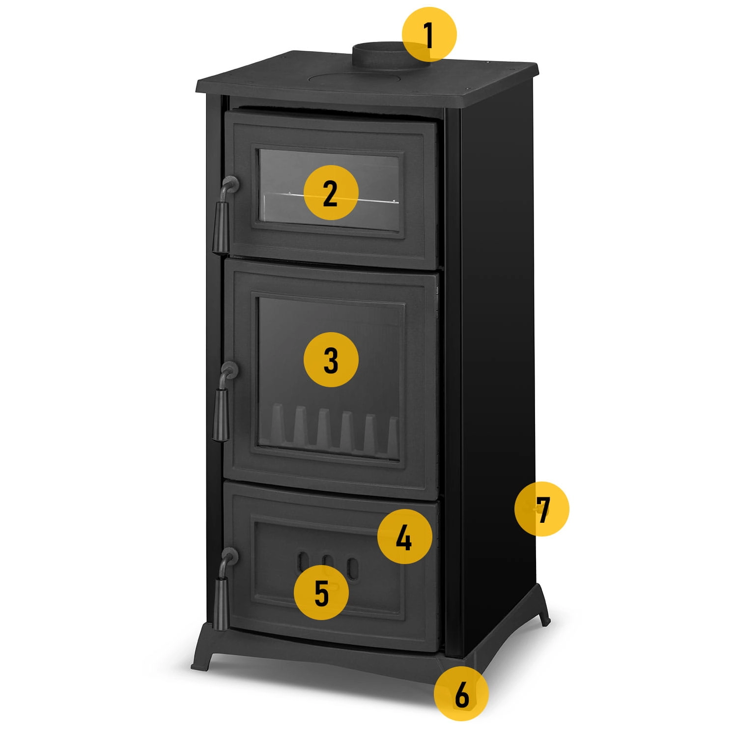1. Górny wylot spalin Ø 130 mm / 2. Komora piekarnika z żeliwnymi drzwiczkami i szybą żaroodporną SCHOTT ROBAX® / 3. Komora spalania z żeliwnymi drzwiczkami i szybą żaroodporną SCHOTT ROBAX® / 4. Komora popielnika z żeliwnymi drzwiczkami / 5. Regulacja szybkości spalania / 6. Mocna żeliwna podstawa pieca z nóżkami / 7. Rączka od ruchomego rusztu