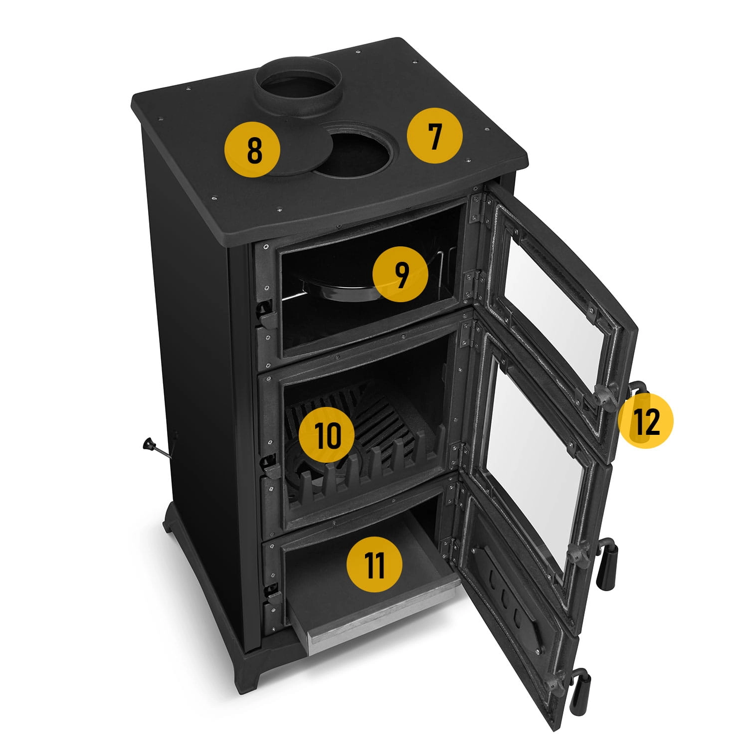 7. Żeliwna płyta grzewcza / 8. Zdejmowany krążek czyli fajerka o średnicy Ø 130 mm / 9. Piekarnik + blacha stalowa emaliowana o średnicy Ø 130 mm / 10. Żeliwny ruszt obrotowy + żeliwny płotek zabezpieczający szybę / 11. Wyjmowany stalowy popielnik / 12. Klamki (3 drzwi: piekarnik, palenisko, popielnik)