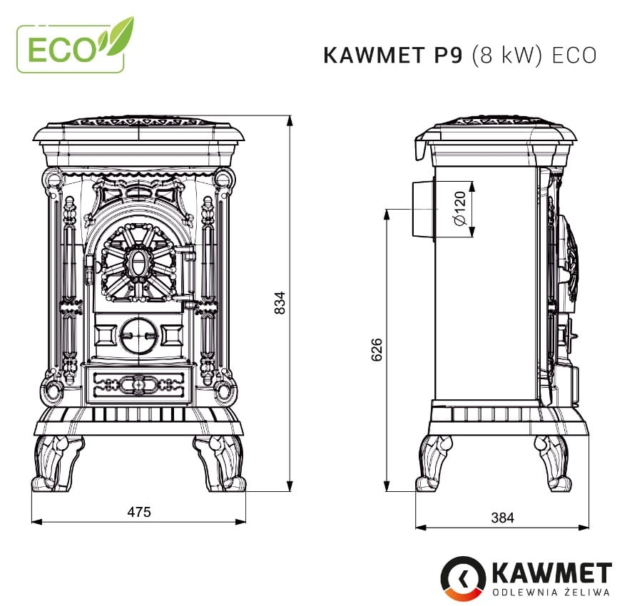 Piec wolnostojący KAWMET P9 EKO o mocy 8 kW wykonany jest z żeliwa szarego. Kominek spełnia normy EkoProjektu. Jego ścianki posiadają grubość od 10 mm do 15 mm. Wylot spalin znajduje się z tyłu piecyka. Średnica wylotu to 120 mm.