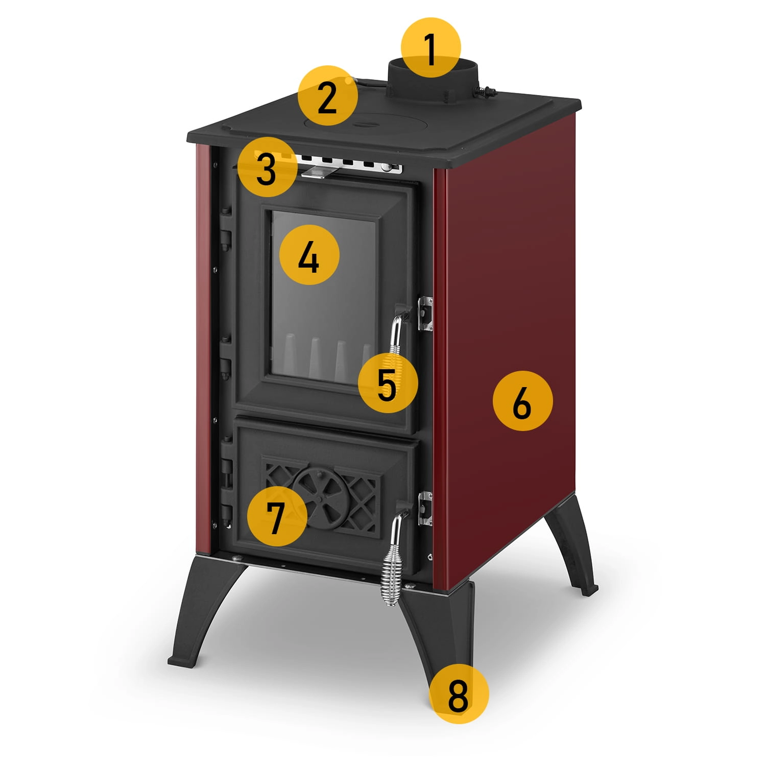 ✅ Górna płyta grzewcza, nogi oraz drzwi: Również wykonane z żeliwa, co nadaje piecowi elegancki wygląd oraz dodatkową trwałość