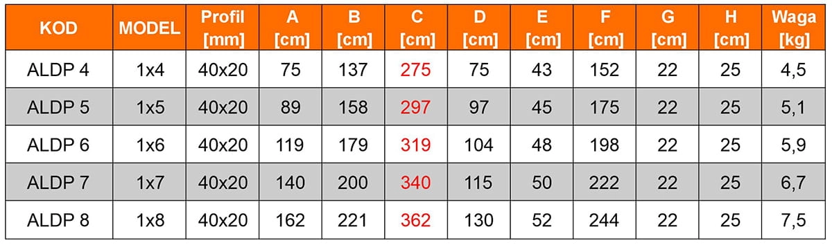 • profil aluminiowy podłużnic: 40 mm x 20 mm