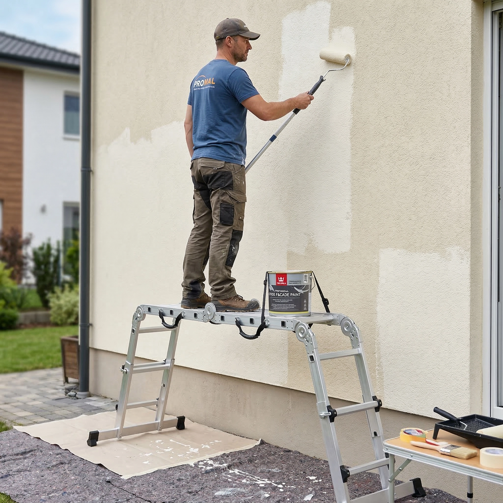 W klasycznym rozstawieniu malarskim drabina HIGHER staje się niezależnym stanowiskiem pracy o wysokości roboczej sięgającej 3 metrów. To Twoje podstawowe narzędzie do malowania ścian, montażu oświetlenia czy drobnych napraw instalacyjnych wewnątrz pomieszczeń.