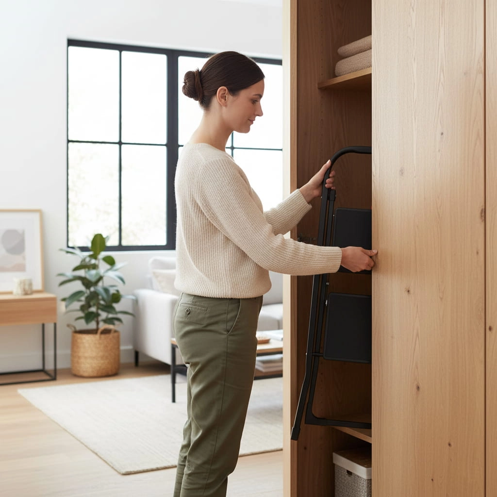 Niewielka szerokość po złożeniu to niezwykle ważna cecha drabiny. Drabina składa się na płasko, co ma olbrzymie znaczenie dla łatwości jej transportowania, a przede wszystkim przechowywania. Dzięki takiej konstrukcji, drabinka z łatwością mieści się w wąskich pomieszczeniach, wnękach czy zakamarkach, co sprawia, że może być praktycznie zawsze pod ręką. Po złożeniu wymiary drabiny wynoszą jedynie 46,5 x 4 x 89 cm, a jej grubość to zaledwie 4 cm!