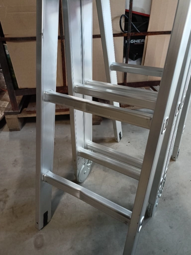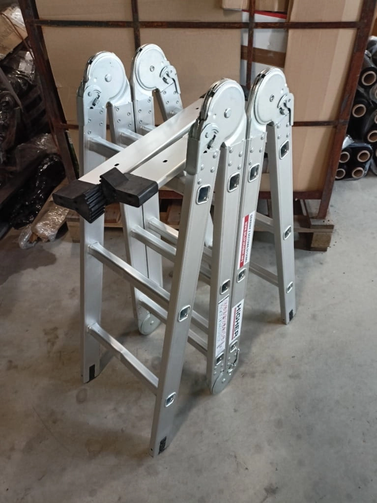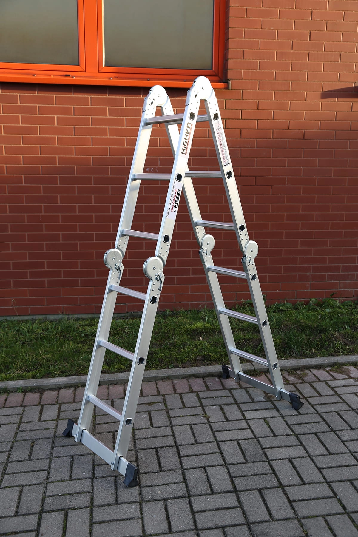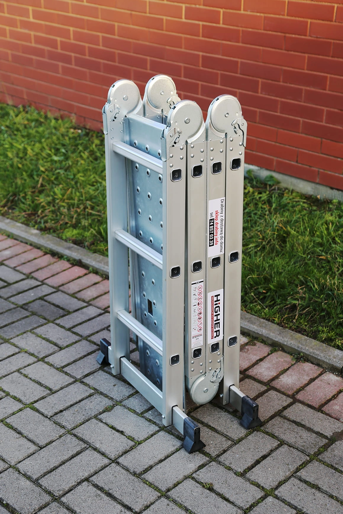Drabina aluminiowa przegubowa 4x4 HIGHER to najbardziej uniwersalna drabina dostępna na naszym rynku. Drabina może być używana jako podest roboczy (podestu nie ma w zestawie), drabina wolnostojąca oraz jako drabina przystawna. Największą zaletą drabiny jest wielofunkcyjność oraz kompaktowe rozmiary po złożeniu.
