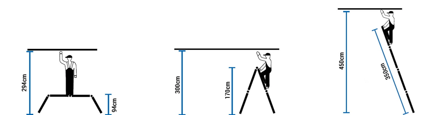 Drabinę przegubową 4x4 HIGHER można przekształcić w podest roboczy o wysokości około 95 cm i zasięgu roboczym około 3 m. Dzięki tej funkcji nie będziesz musiał stosować podestów czy rusztowań. Wysokości drabiny pozwolą bez problemu wykonać większość prac w pomieszczeniach wewnętrznych.