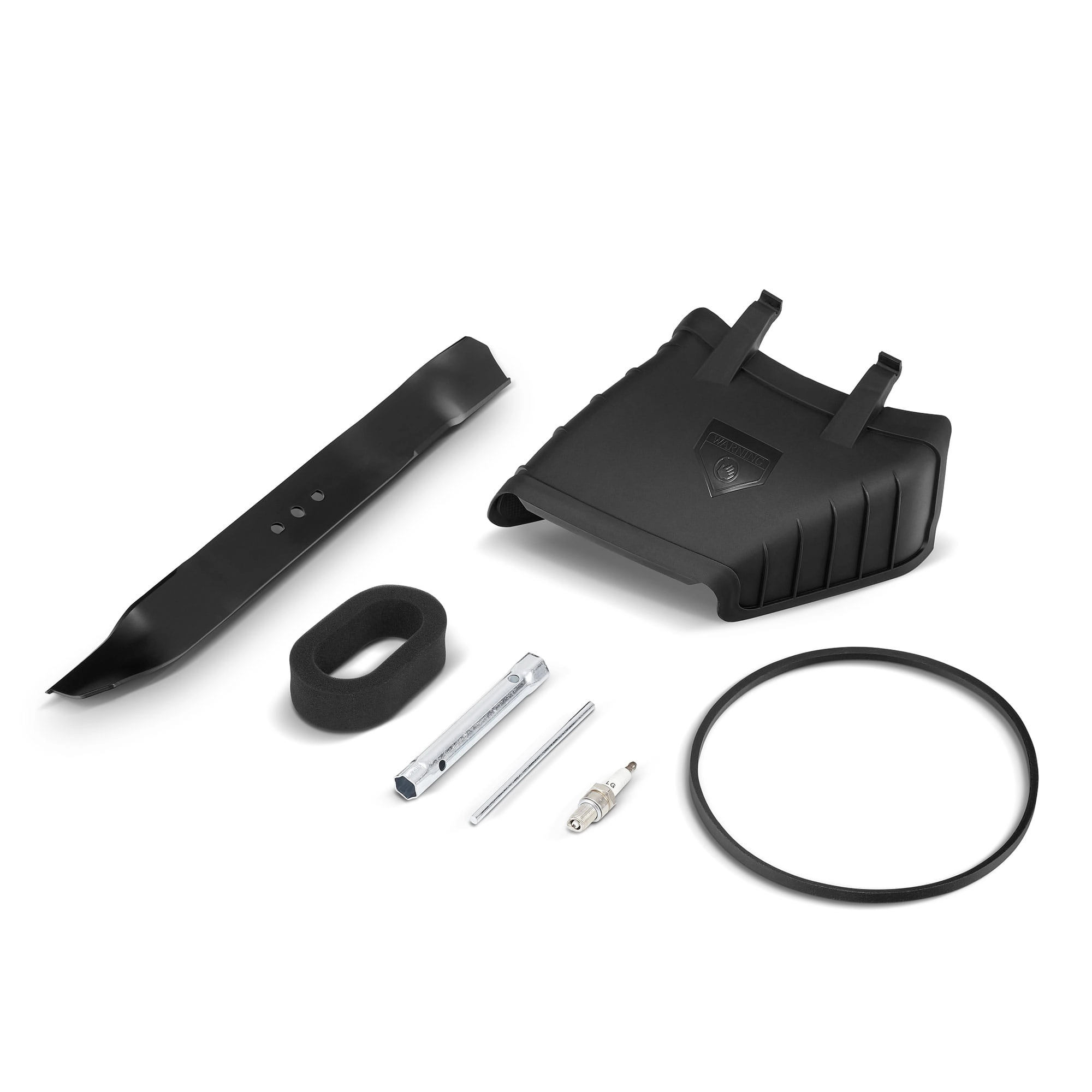 ✅ Kompletny zestaw akcesoriów serwisowych dostarczany z maszyną: zapasowy nóż tnący, wtyczka mulczująca, przystawka wyrzutu bocznego oraz dedykowany klucz do świec.