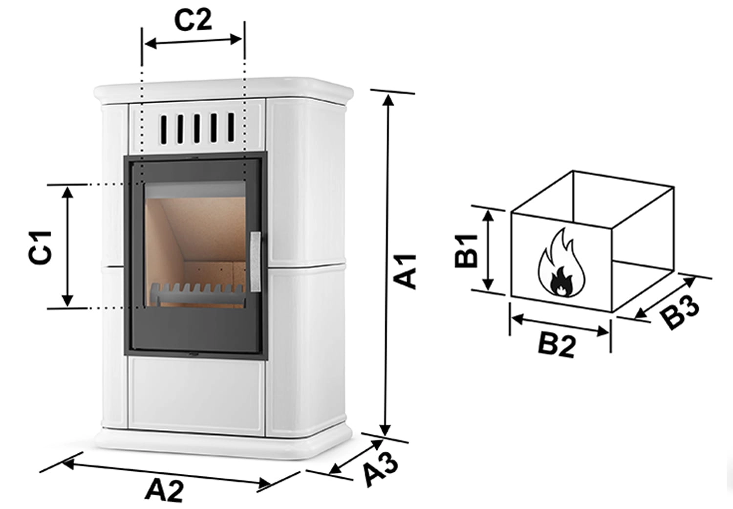 - głębokość paleniska (wymiar B3): 28 cm