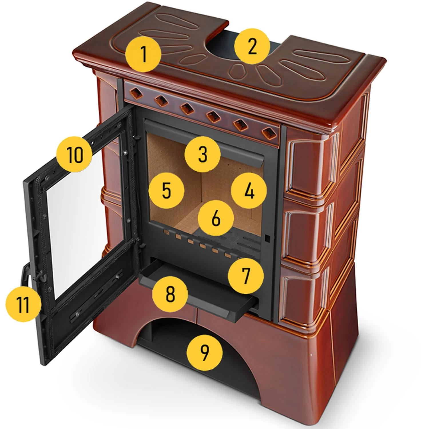 Efekt grzewczy znacznie zwiększają wszystkie kafle ceramiczne, które dzięki zdolnościom akumulacji ciepła doskonale przekazują ciepło do pomieszczenia. Kominek posiada doprowadzenie powietrza pierwotnego i wtórnego a także regulatory służące do kontroli ilości doprowadzanego powietrza do komory spalania. Sterowanie dopływem powietrza pozwala kontrolować szybkość spalania i sterować mocą kominka.