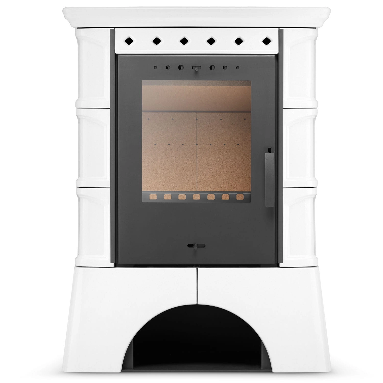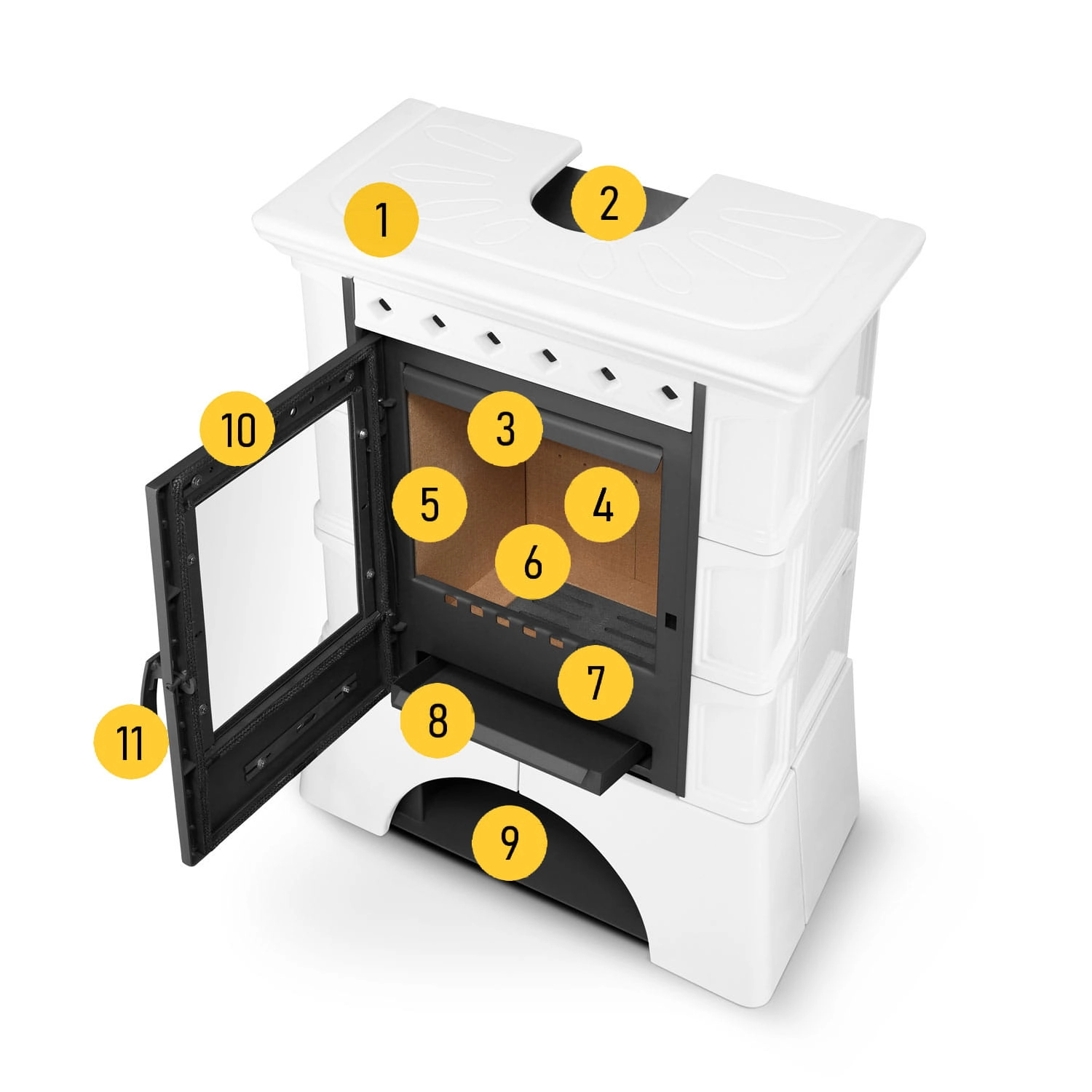 Efekt grzewczy znacznie zwiększają wszystkie kafle ceramiczne, które dzięki zdolnościom akumulacji ciepła doskonale przekazują ciepło do pomieszczenia. Kominek posiada doprowadzenie powietrza pierwotnego i wtórnego a także regulatory służące do kontroli ilości doprowadzanego powietrza do komory spalania. Sterowanie dopływem powietrza pozwala kontrolować szybkość spalania i sterować mocą kominka.