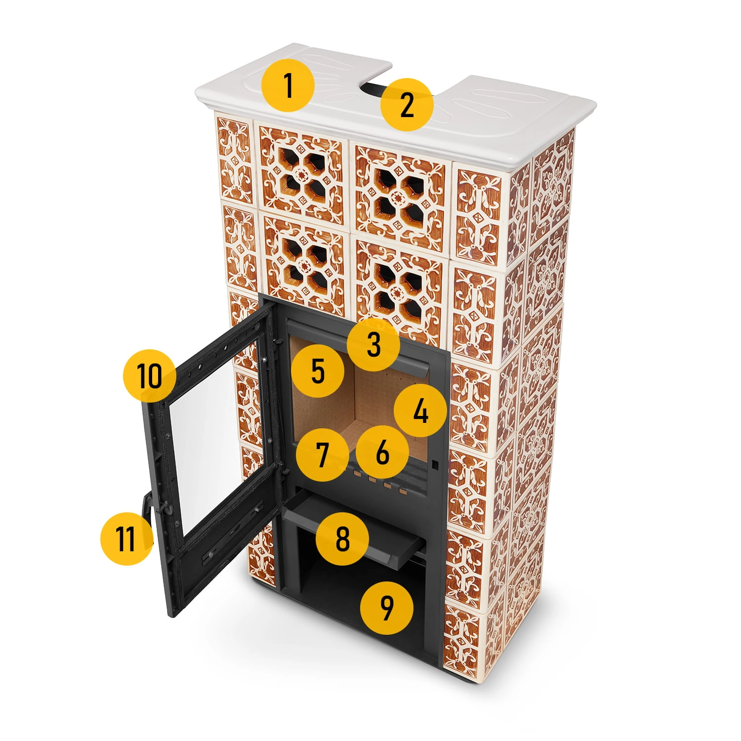 - Materiał wykonania: stalowy wkład / obudowa z kafli ceramicznych