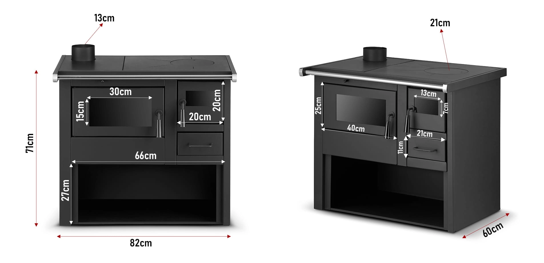 - Wymiary pieca: wysokość - 710 mm / szerokość - 820 mm / głębokość - 600 mm