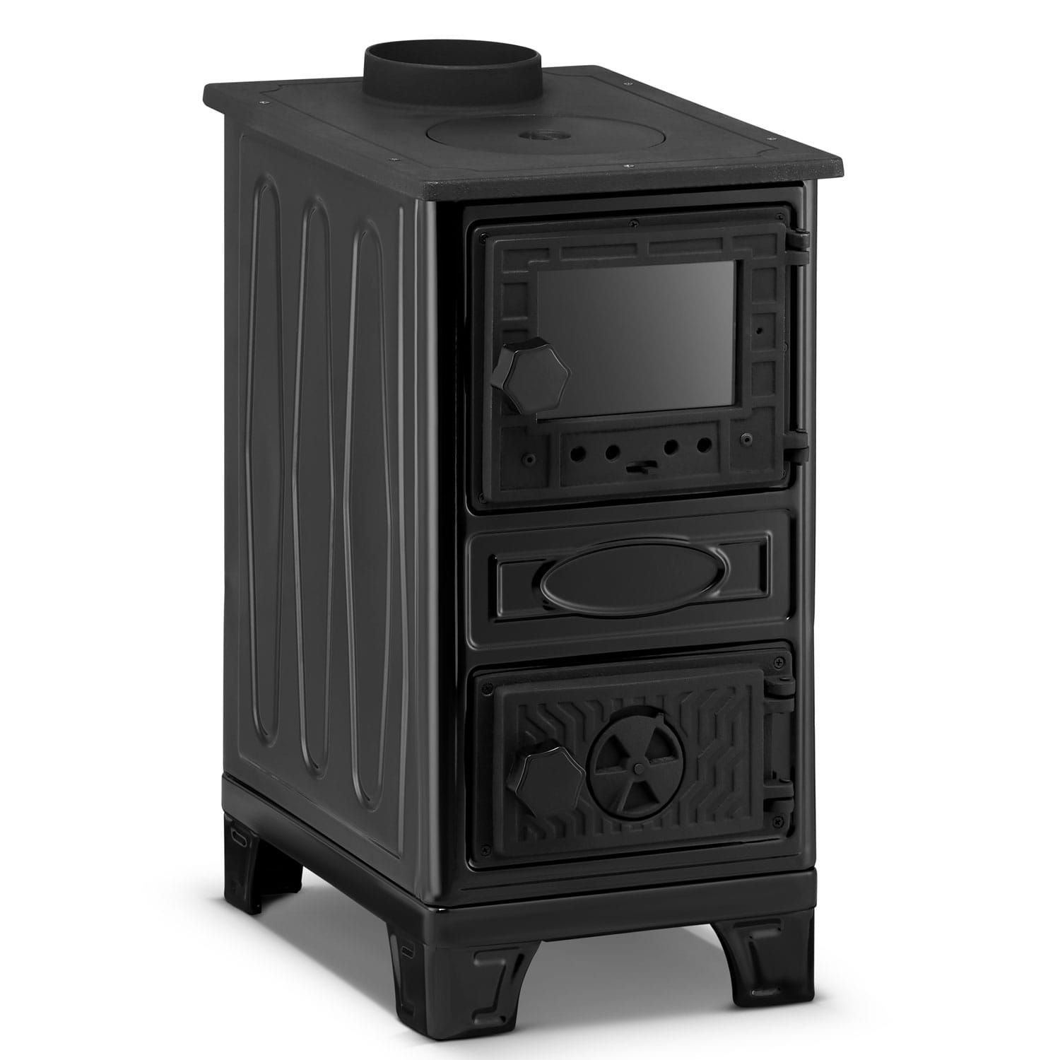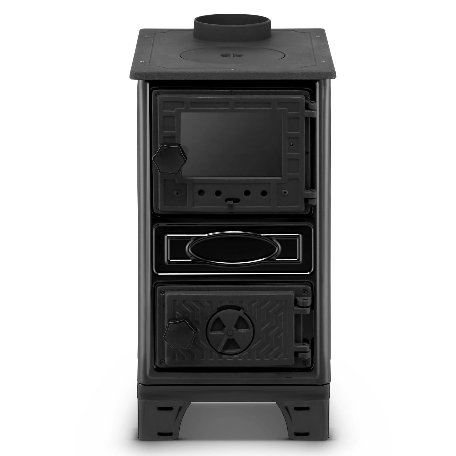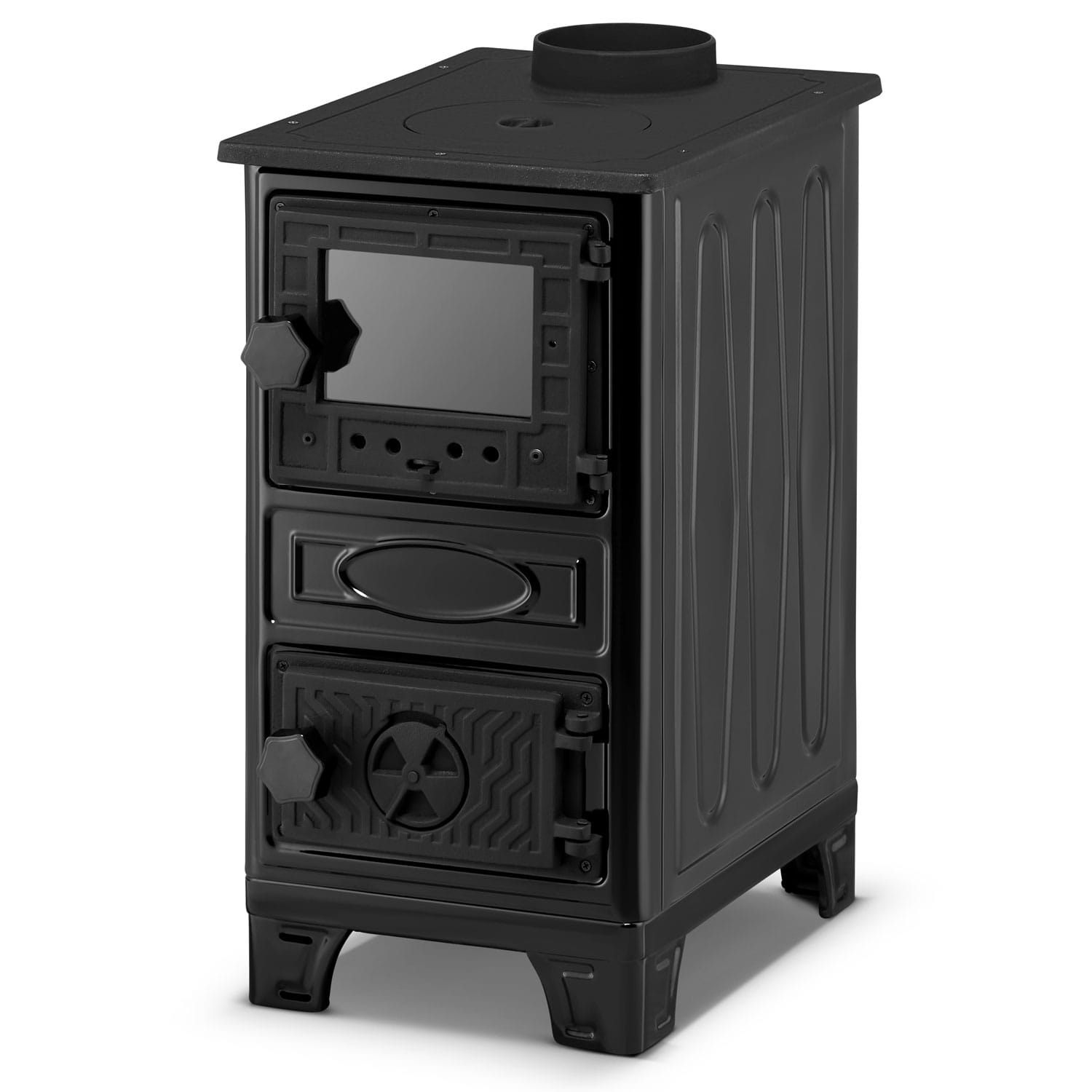 - Mocne żeliwo: płyta górna, drzwi i palenisko są wykonane z solidnego żeliwa. Odporne na uszkodzenia i wysokie temperatury – piec posłuży Ci przez lata.