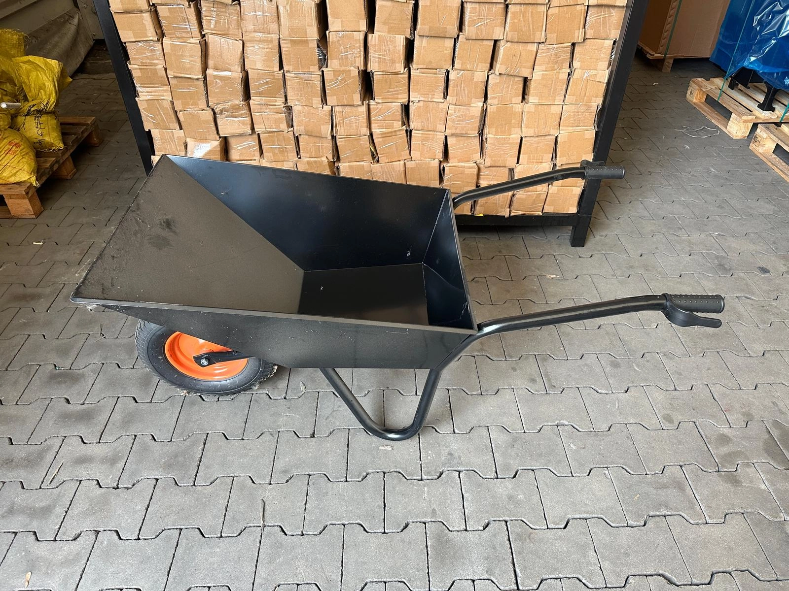 Taczka budowlana, spawana HIGHER na pompowanym kole o średnicy 400 mm.