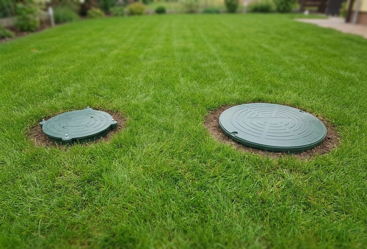 Ułatwia to koszenie trawy i codzienną eksploatację systemu bez konieczności uciążliwego odkopywania zbiornika przy każdym przeglądzie.
