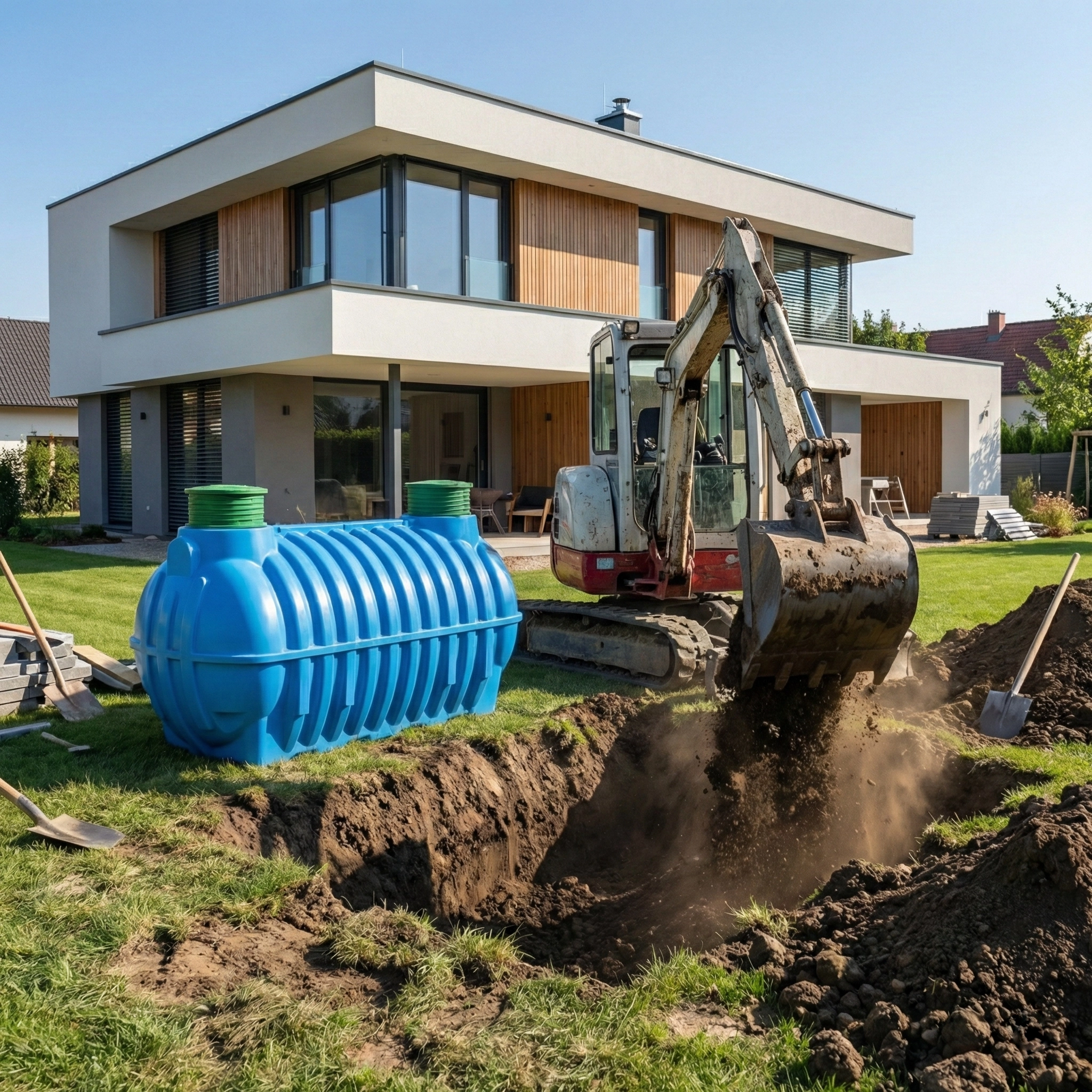Pamiętaj, że montaż to proces dynamiczny – zasypując zbiornik warstwami co 20 cm i jednocześnie napełniając go wodą, tworzysz idealną równowagę ciśnień. Ta technika zapobiega wypchnięciu zbiornika przez wody gruntowe oraz chroni go przed odkształceniami. Prawidłowy montaż wymaga wprawdzie odrobiny precyzji i zachowania dystansów od infrastruktury, takich jak 2 metry od granicy działki czy 1,5 metra od rur gazowych.