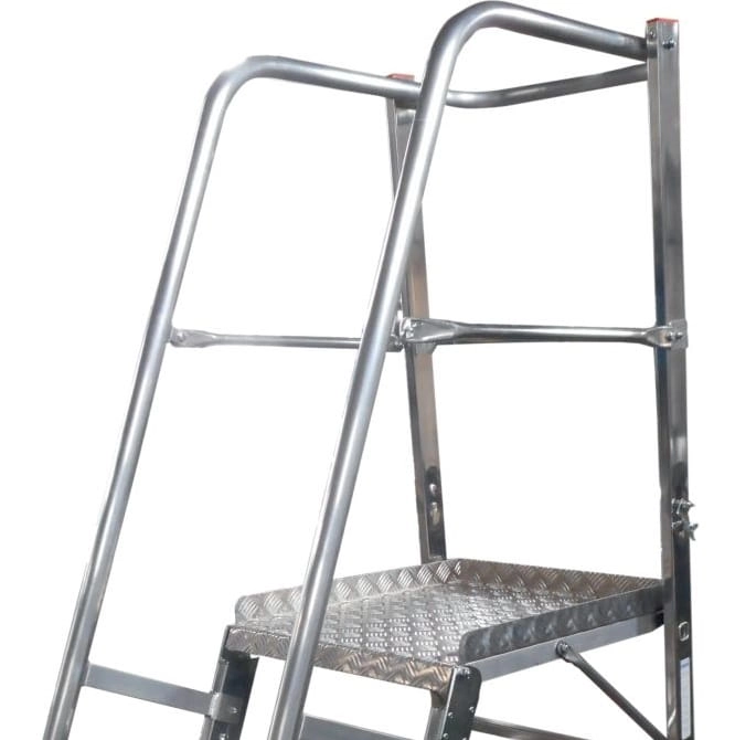 Aluminiowy podest jezdny z jednostronnym wejściem wyposażony jest w chroniące barierki z trzech stron platformy oraz poręcze po obu stronach schodów, co zapewnia jeszcze większą ochronę i bezpieczeństwo podczas prac na wysokości.