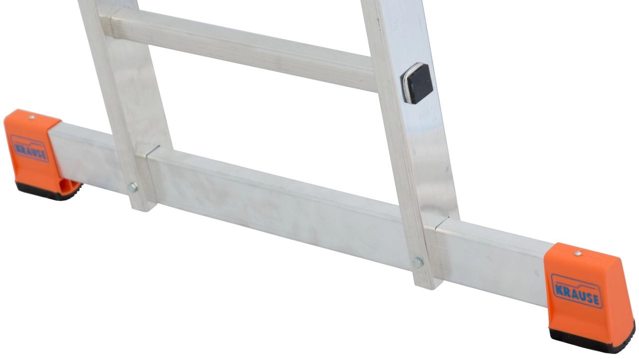 Aluminiowe końce drabiny pokryte są dwukomponentowymi stopkami z tworzywa, które są antypoślizgowe oraz odporne na ścieranie. Dzięki systemowi SafetyCap drabina jest niezwykle stabilna oraz wytrzymała. Dodatkowo dla zwiększenia bezpieczeństwa rozszerzono oraz wzmocniono dolne części drabiny oraz zastosowano szeroki stabilizator przykręcony do zewnętrznych elementów drabiny.
