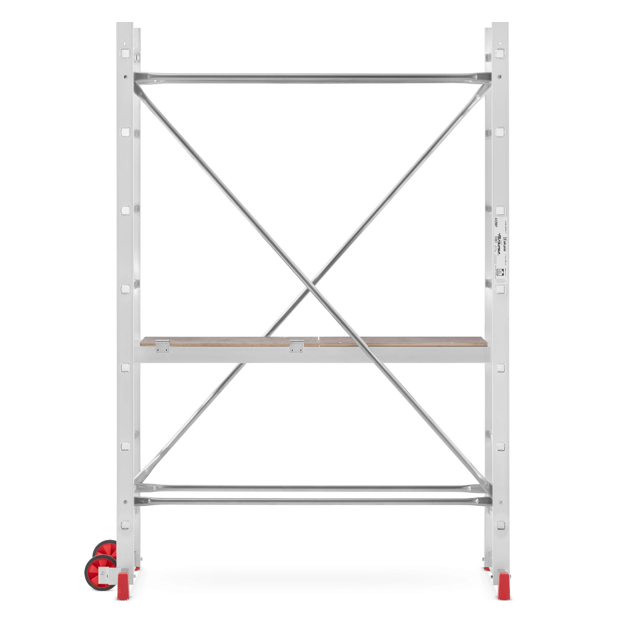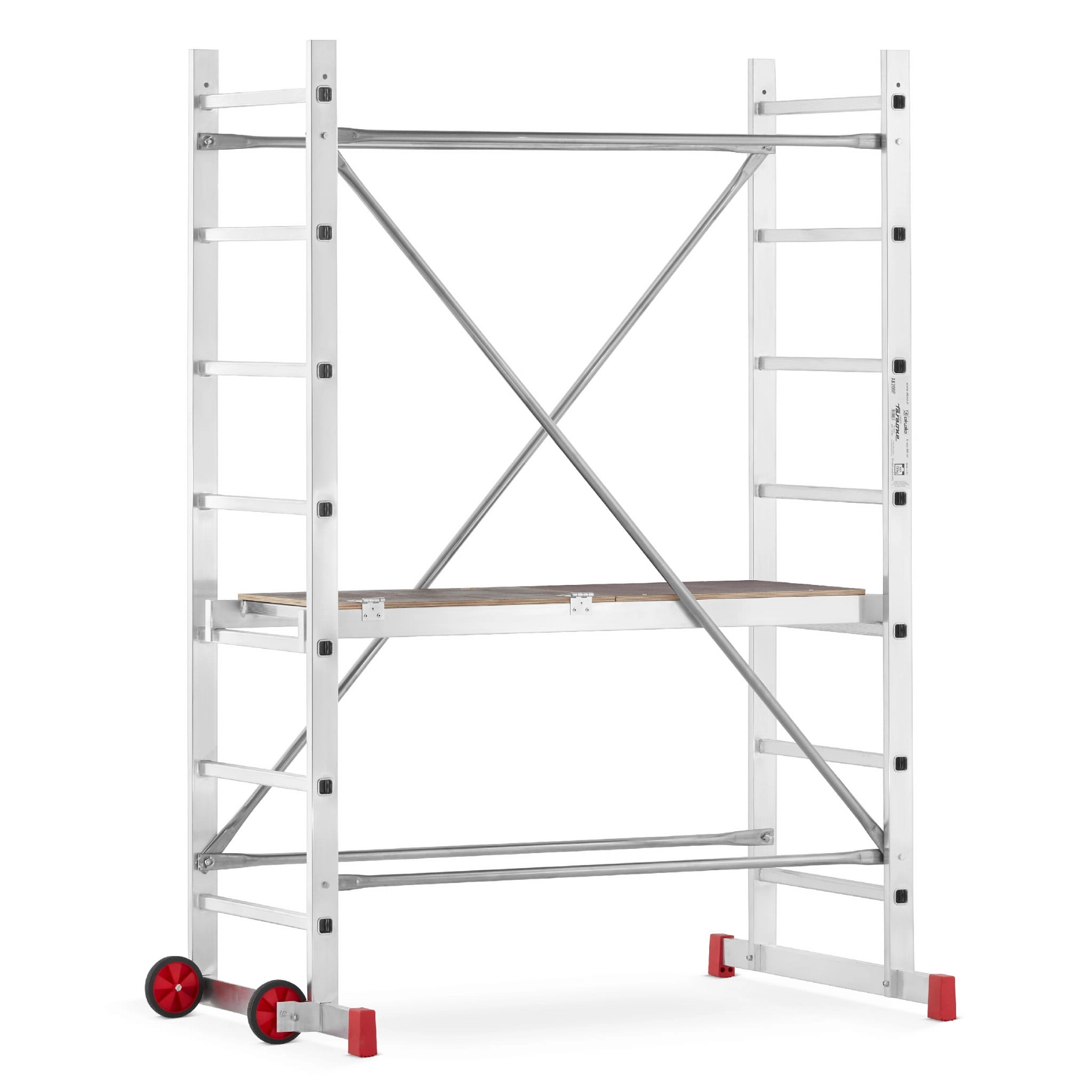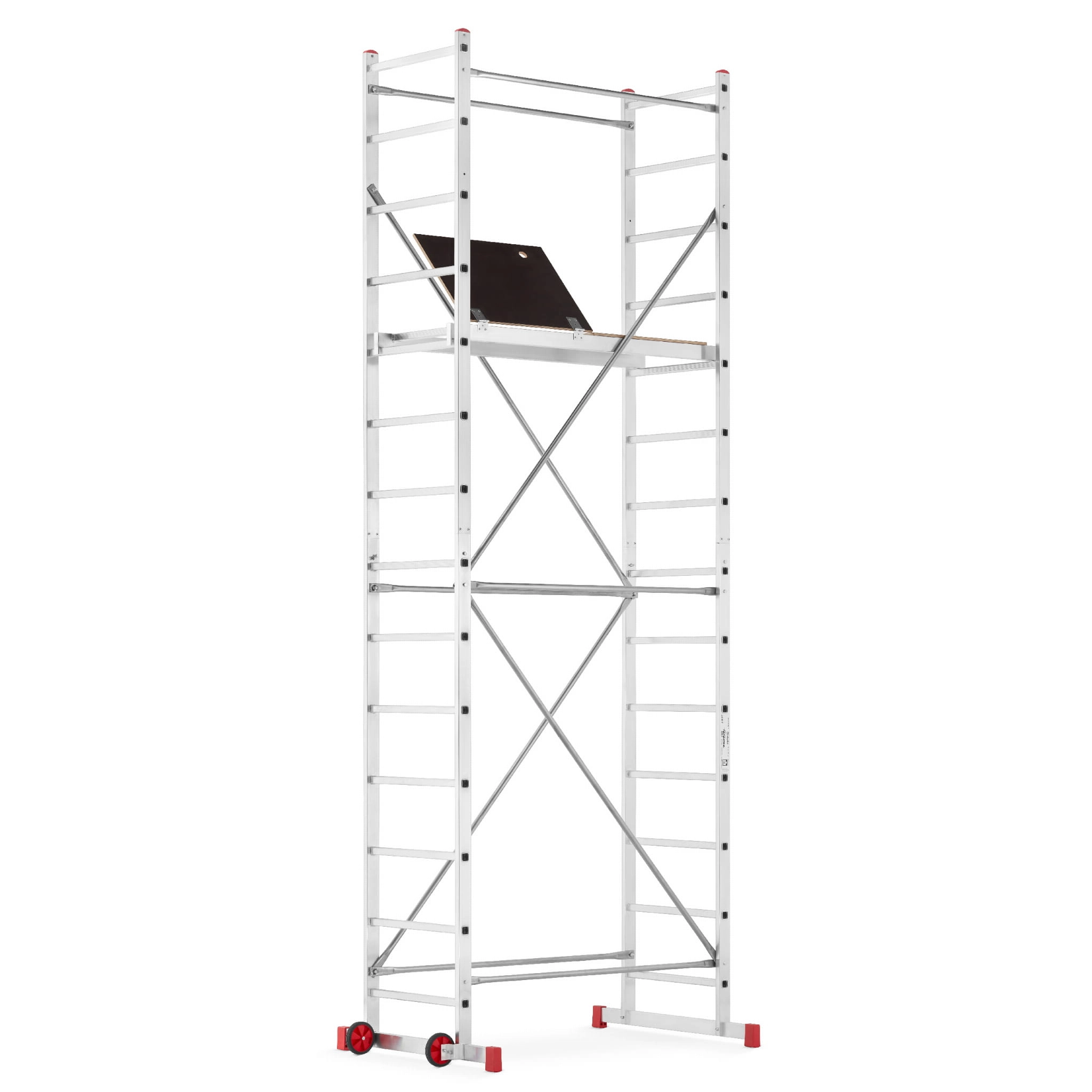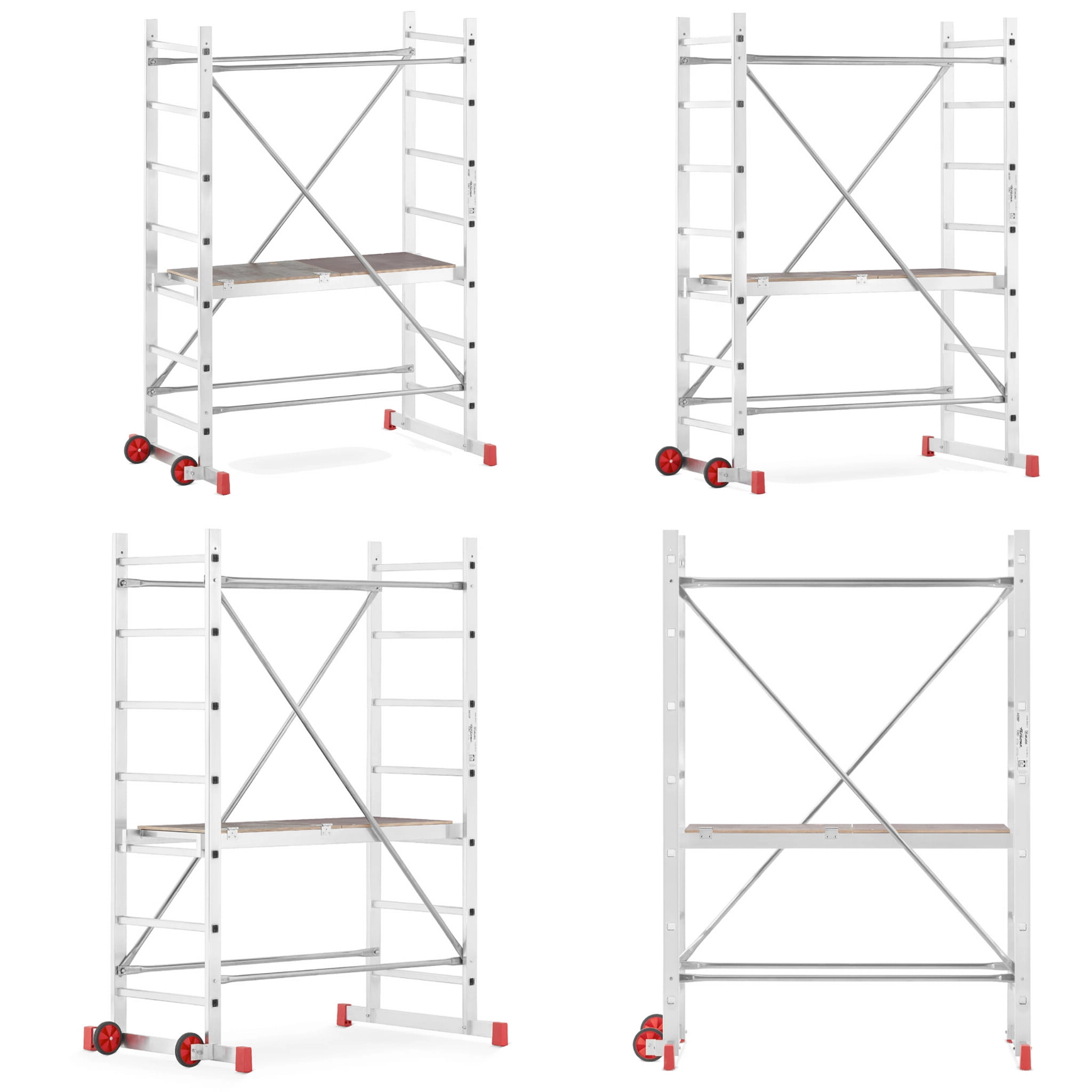 - Podest roboczy antypoślizgowy – element wyposażenia każdego rusztowania; podest wykonany na ramie aluminiowej ze sklejką wodoodporną. Podest stanowi podstawę do pracy dla użytkownika. Pełni również ważną rolę konstrukcyjną, bowiem odpowiednio usztywnia i spina całą konstrukcję. Montaż podestu oparty jest na tym samym systemie co stężeń ukośnych i poziomych.