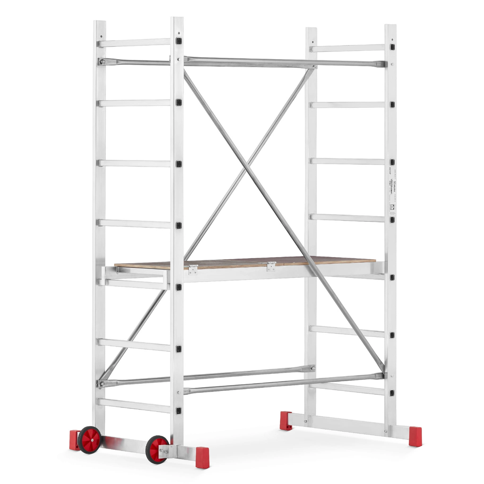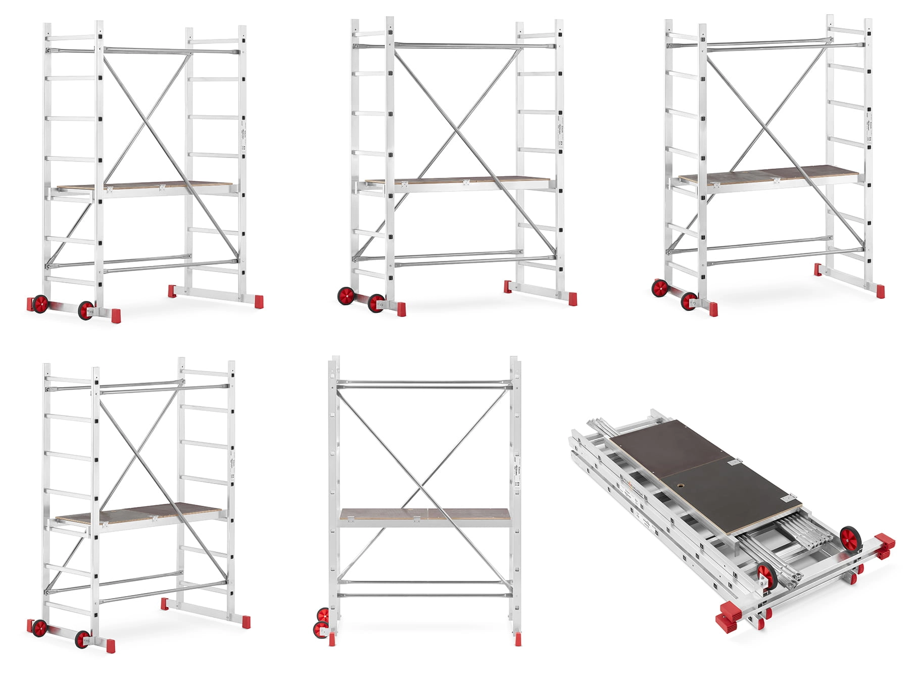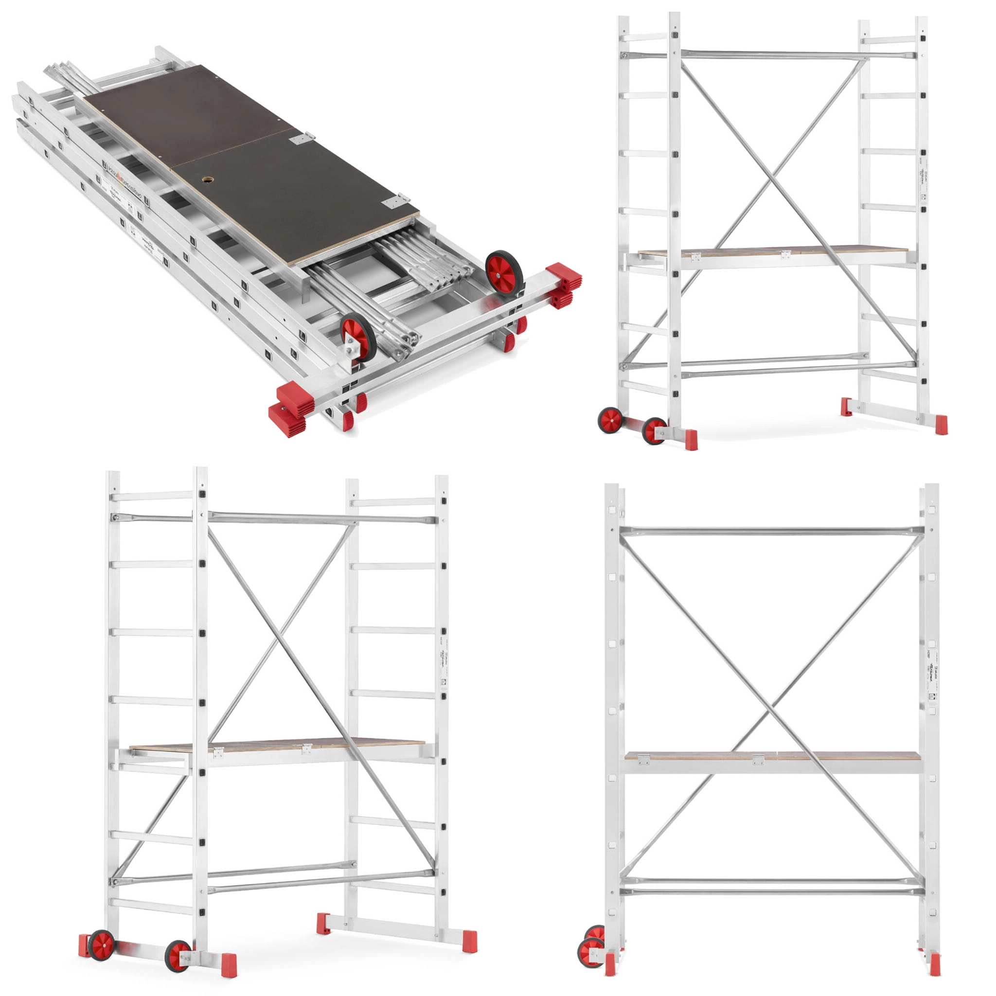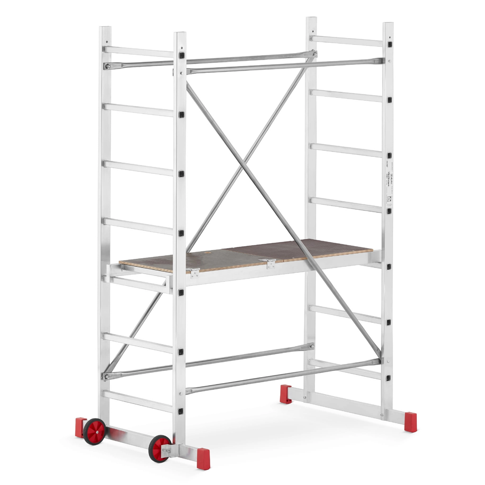 - Podest roboczy antypoślizgowy – element wyposażenia każdego rusztowania; podest wykonany na ramie aluminiowej ze sklejką wodoodporną. Podest stanowi podstawę do pracy dla użytkownika. Pełni również ważną rolę konstrukcyjną, bowiem odpowiednio usztywnia i spina całą konstrukcję. Montaż podestu oparty jest na tym samym systemie co stężeń ukośnych i poziomych.