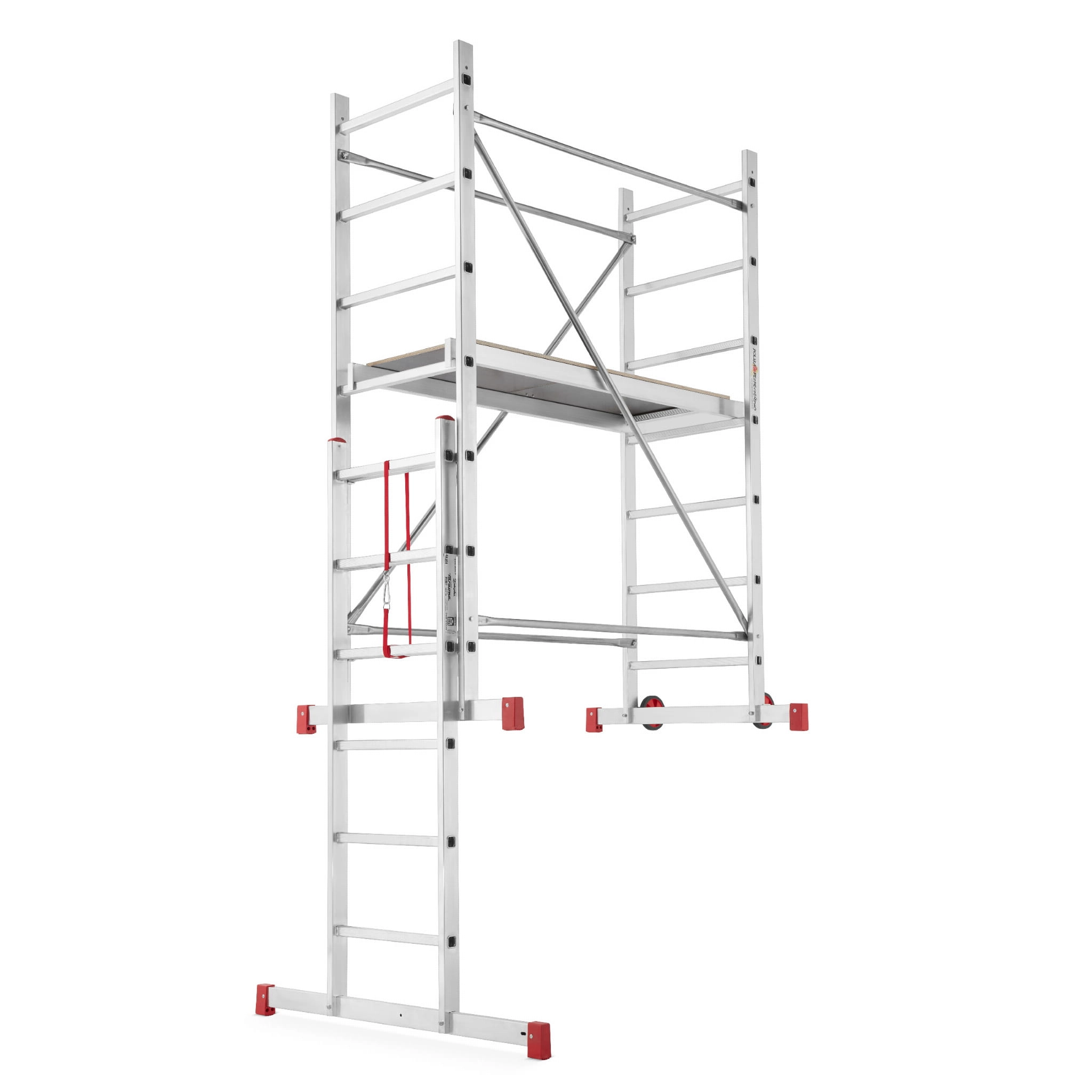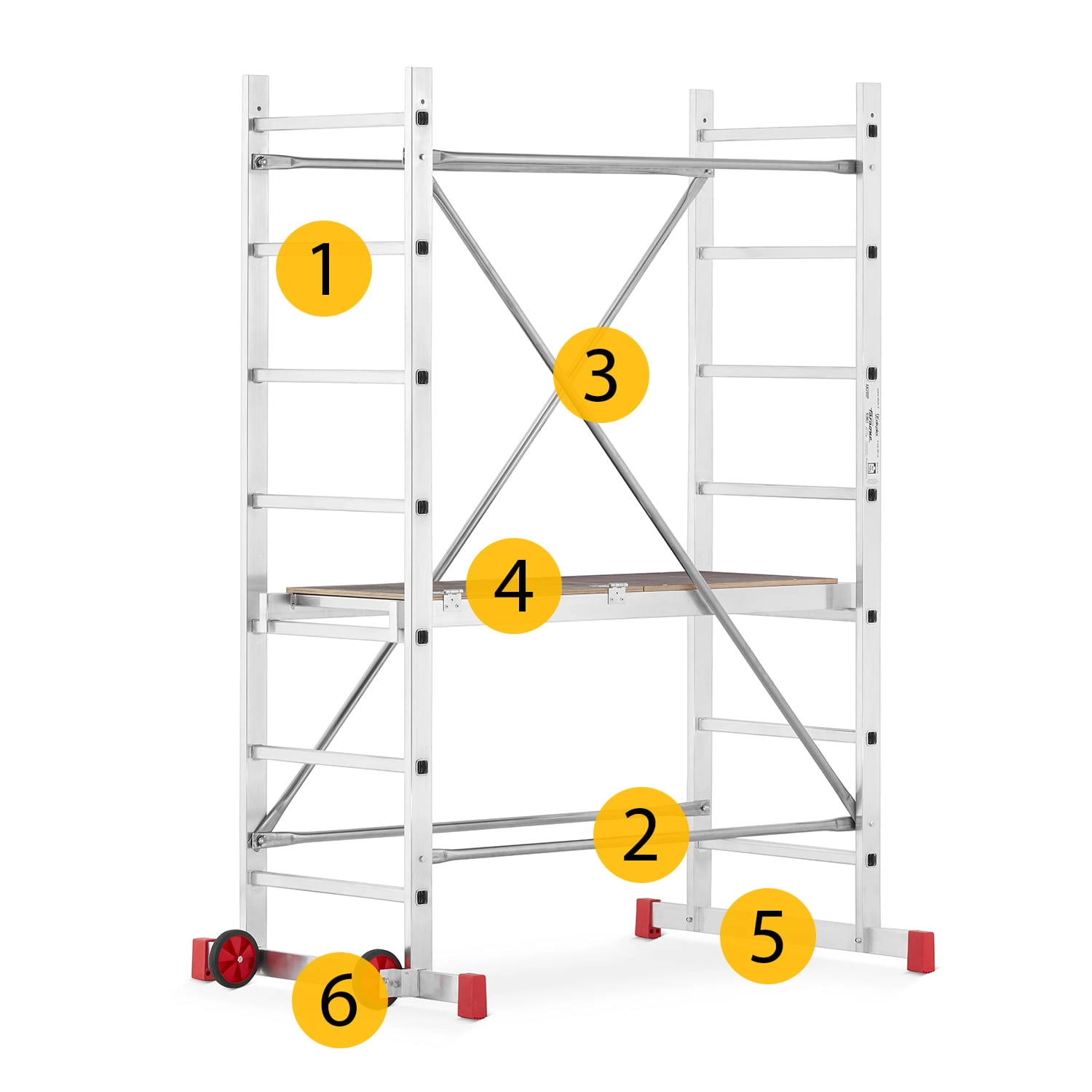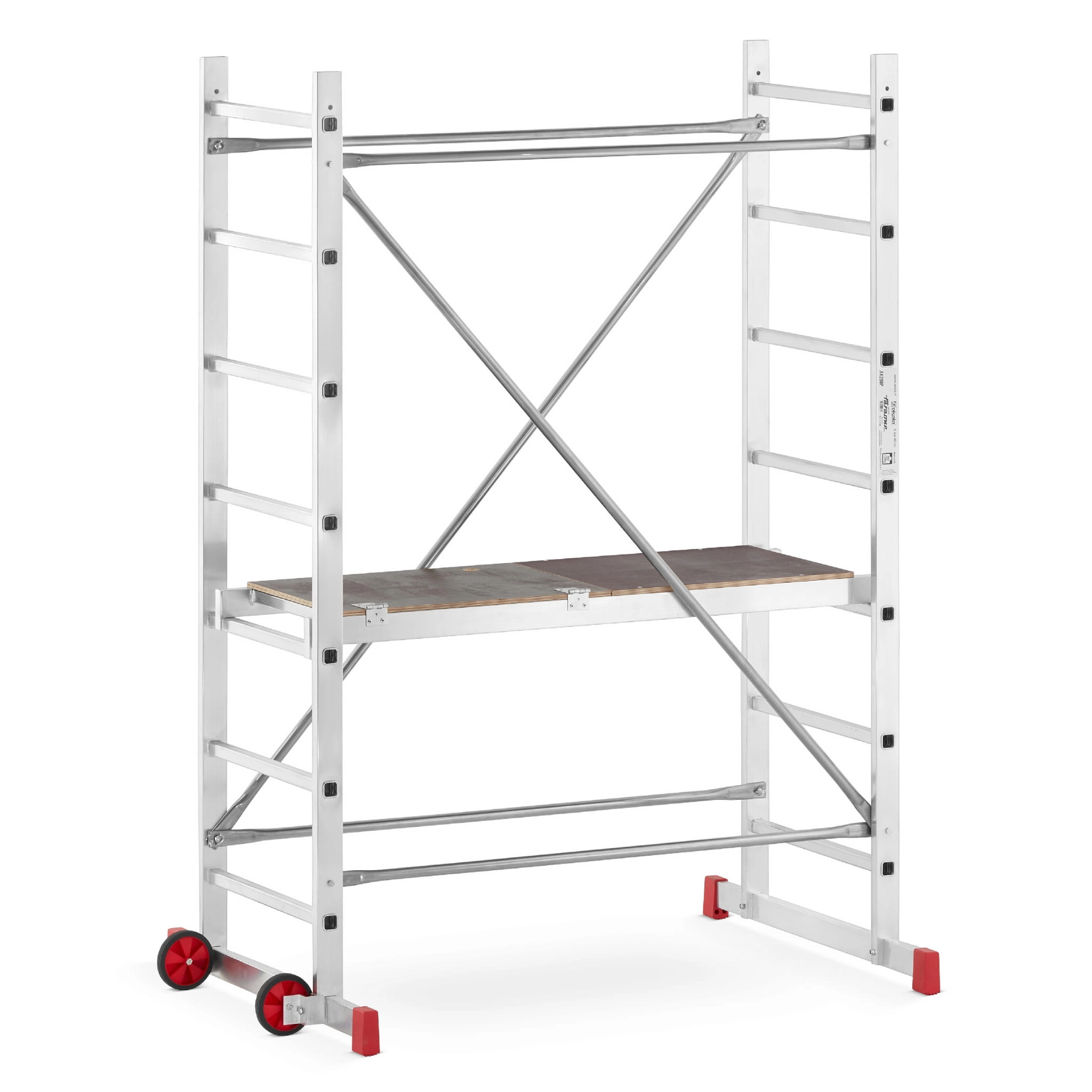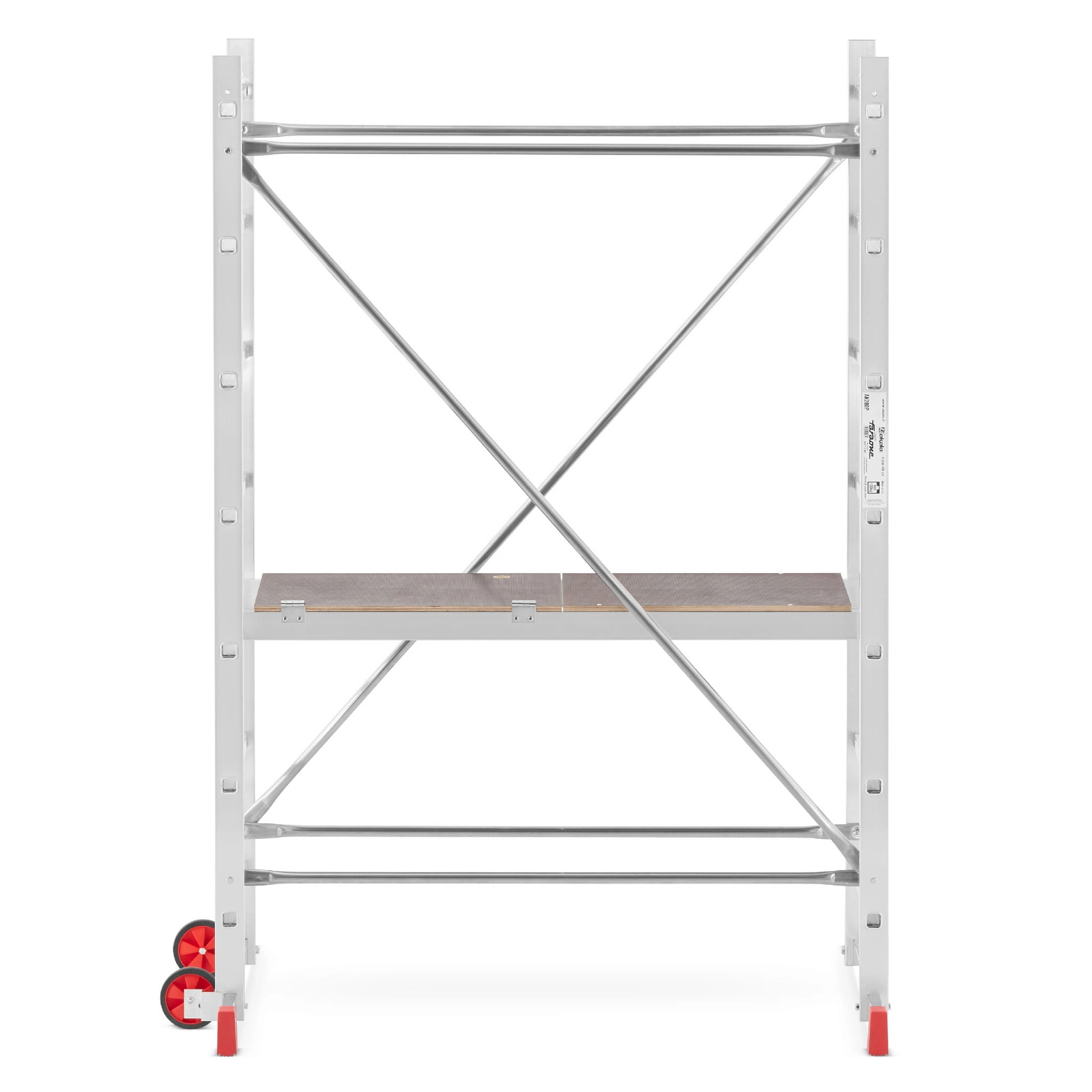 - Podest roboczy antypoślizgowy – element wyposażenia każdego rusztowania; podest wykonany na ramie aluminiowej ze sklejką wodoodporną. Podest stanowi podstawę do pracy dla użytkownika. Pełni również ważną rolę konstrukcyjną, bowiem odpowiednio usztywnia i spina całą konstrukcję. Montaż podestu oparty jest na tym samym systemie co stężeń ukośnych i poziomych.