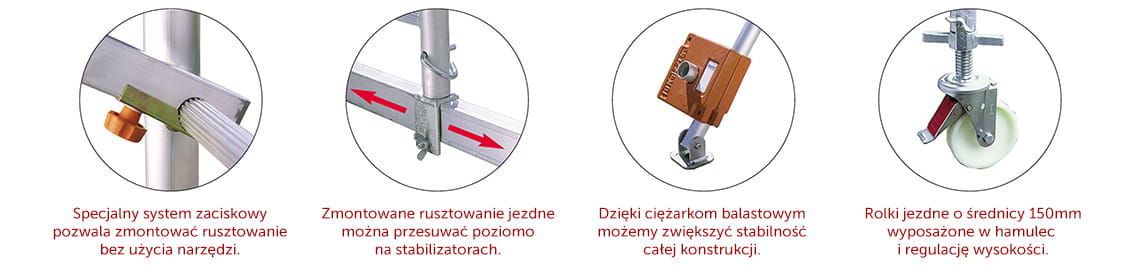 - Po dokupieniu dodatkowych elementów możliwość przebudowy rusztowania w platformę montażową o wymiarach: szerokość: 2,1 m x długość: 2 m