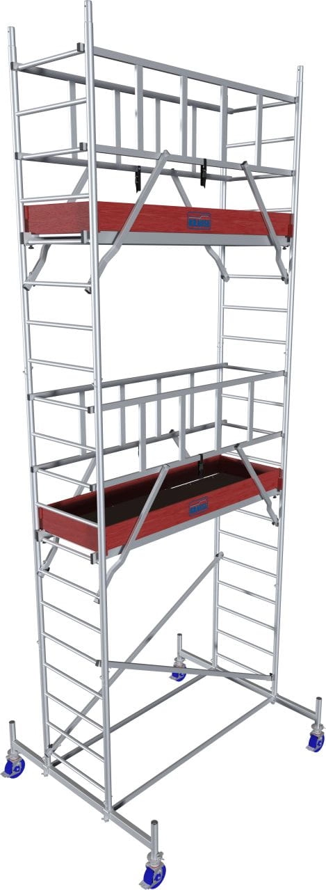 - Po dokupieniu dodatkowych elementów możliwość przebudowy rusztowania w platformę montażową o wymiarach: szerokość: 2,1 m x długość: 2 m