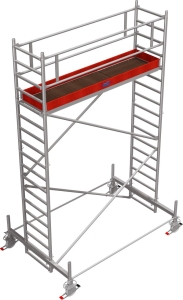 Regulowane rolki jezdne (Ø 200 mm) pozwalają użytkować rusztowanie nawet na nierównym terenie (płynna regulacja wysokości do 30 cm). Prosta i szybka zmiana wysokości pomostów (co 25 cm) bez konieczności demontażu i ponownego montażu innych elementów rusztowania.