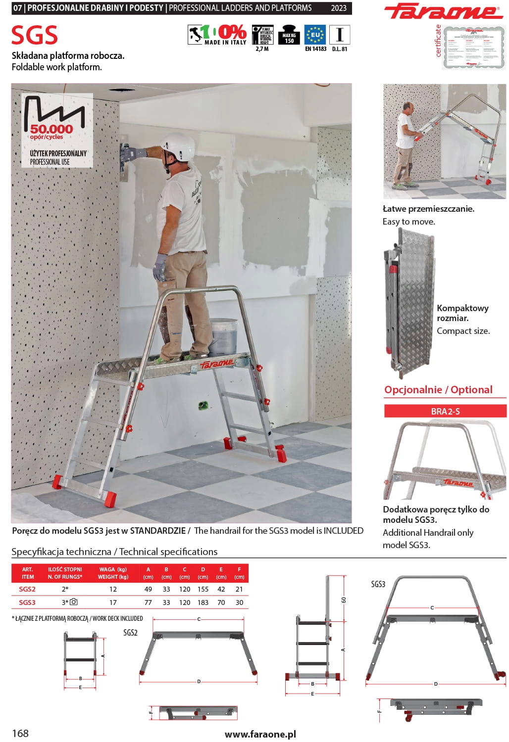 Bezpieczeństwo użytkowników jest priorytetem FARAONE, dlatego poręcz w modelu SGS3 jest dostarczana w standardzie, zapewniając dodatkową stabilność i ułatwiając obsługę podestu w różnych warunkach.