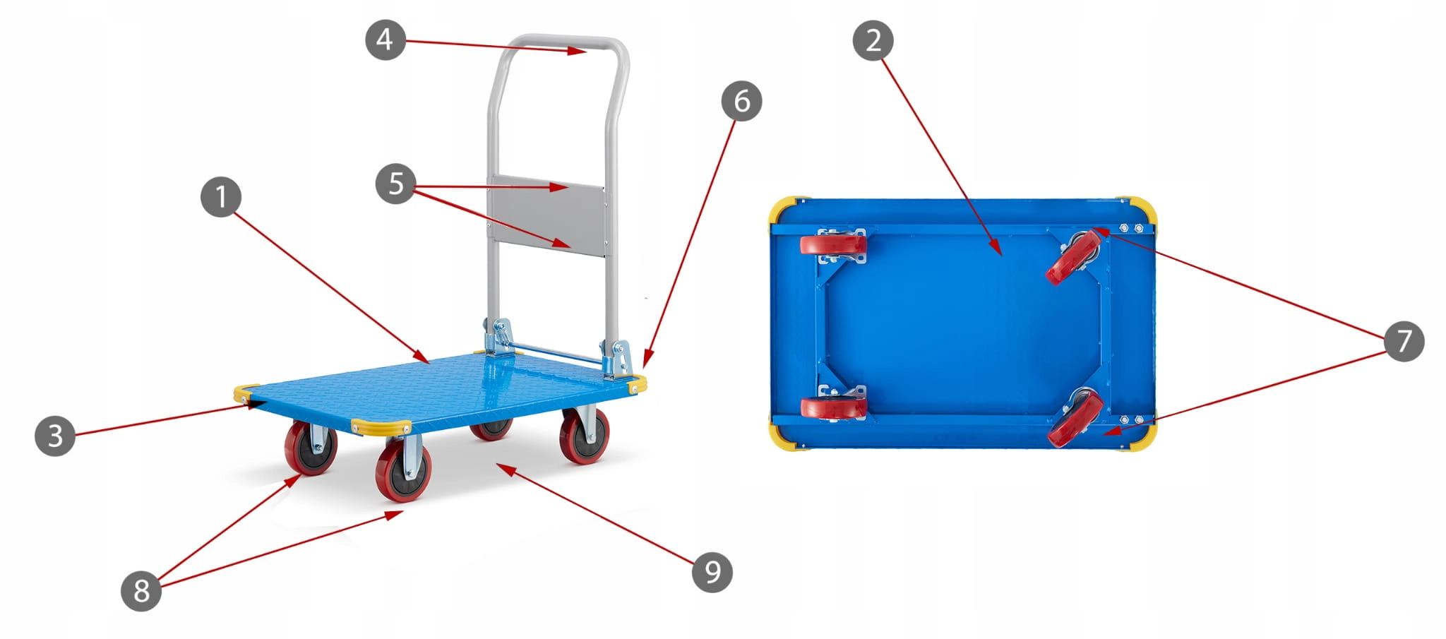 Wymiary platformy transportowej ▸ 76 cm x 46 cm | Wysokość całkowita ▸ 89 cm | Średnica kół ▸ 120 mm | Waga ▸ 20 kg
