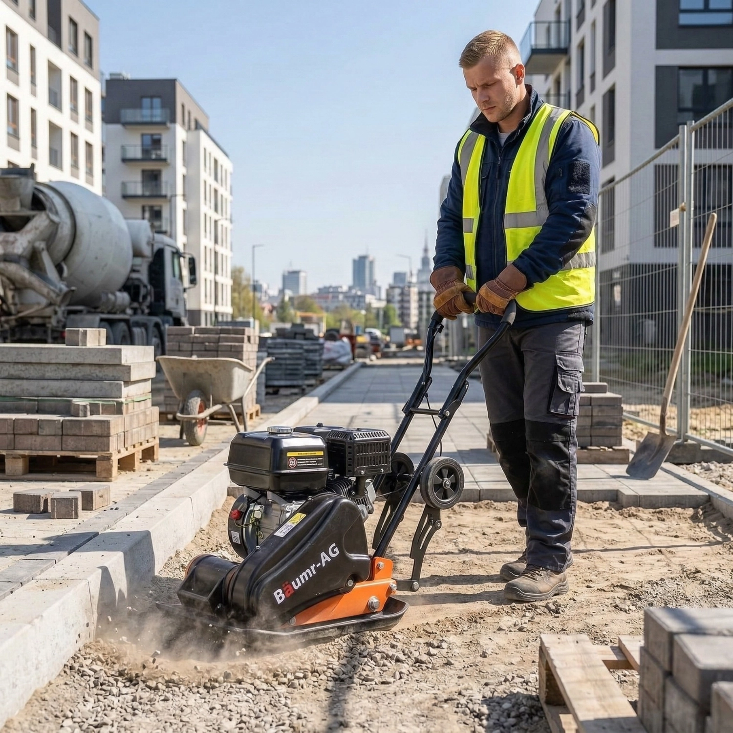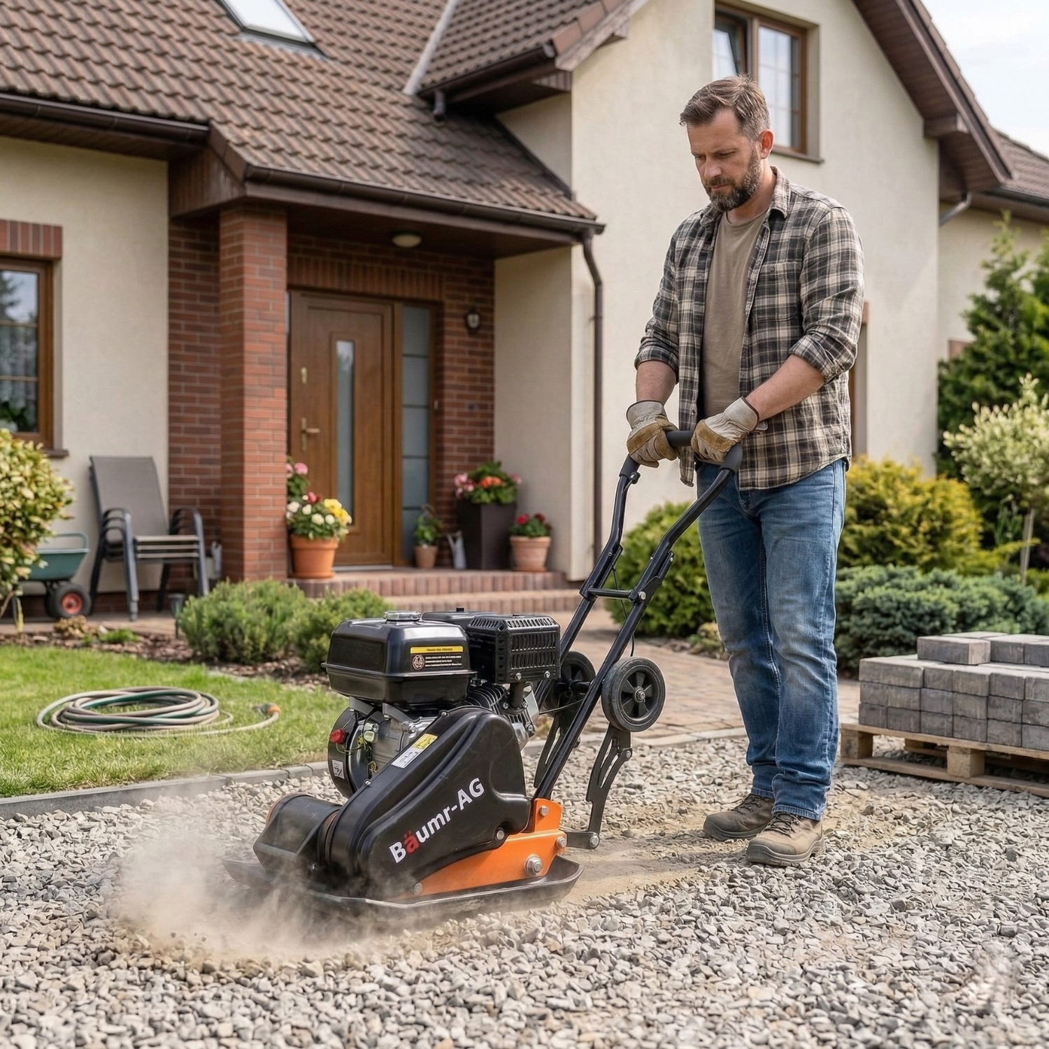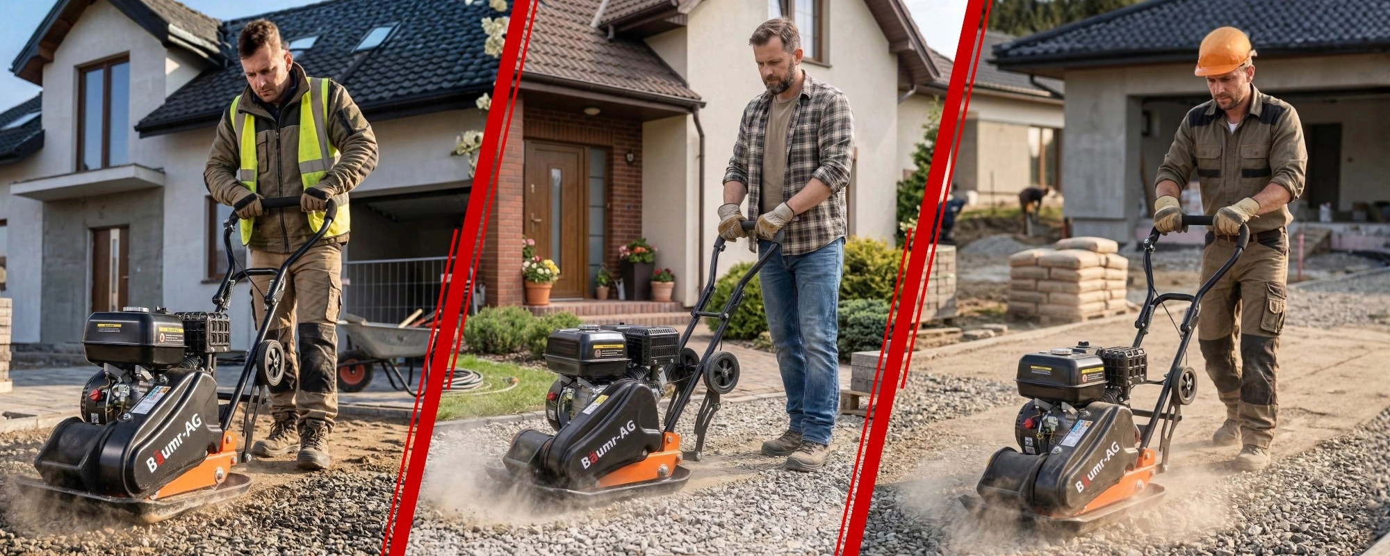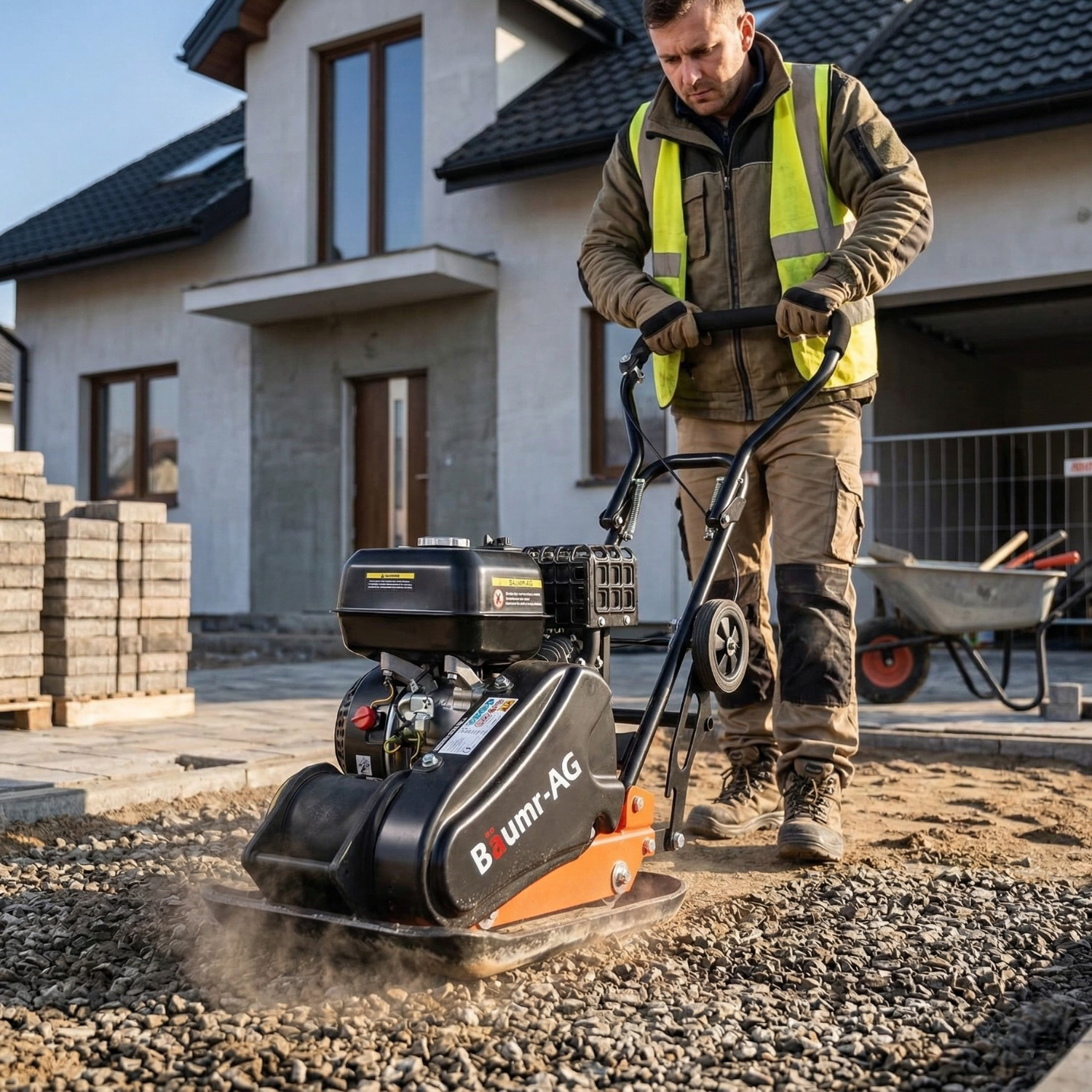 Urządzenie zostało zaprojektowane z myślą o najbardziej wymagających użytkownikach, zarówno tych prowadzących profesjonalne firmy brukarskie, jak i ambitnych właścicieli domów, którzy samodzielnie przygotowują podłoże pod taras czy podjazd. Solidność konstrukcji widać tu w każdym detalu – od grubych spawów po doskonale spasowane elementy osłony silnika.